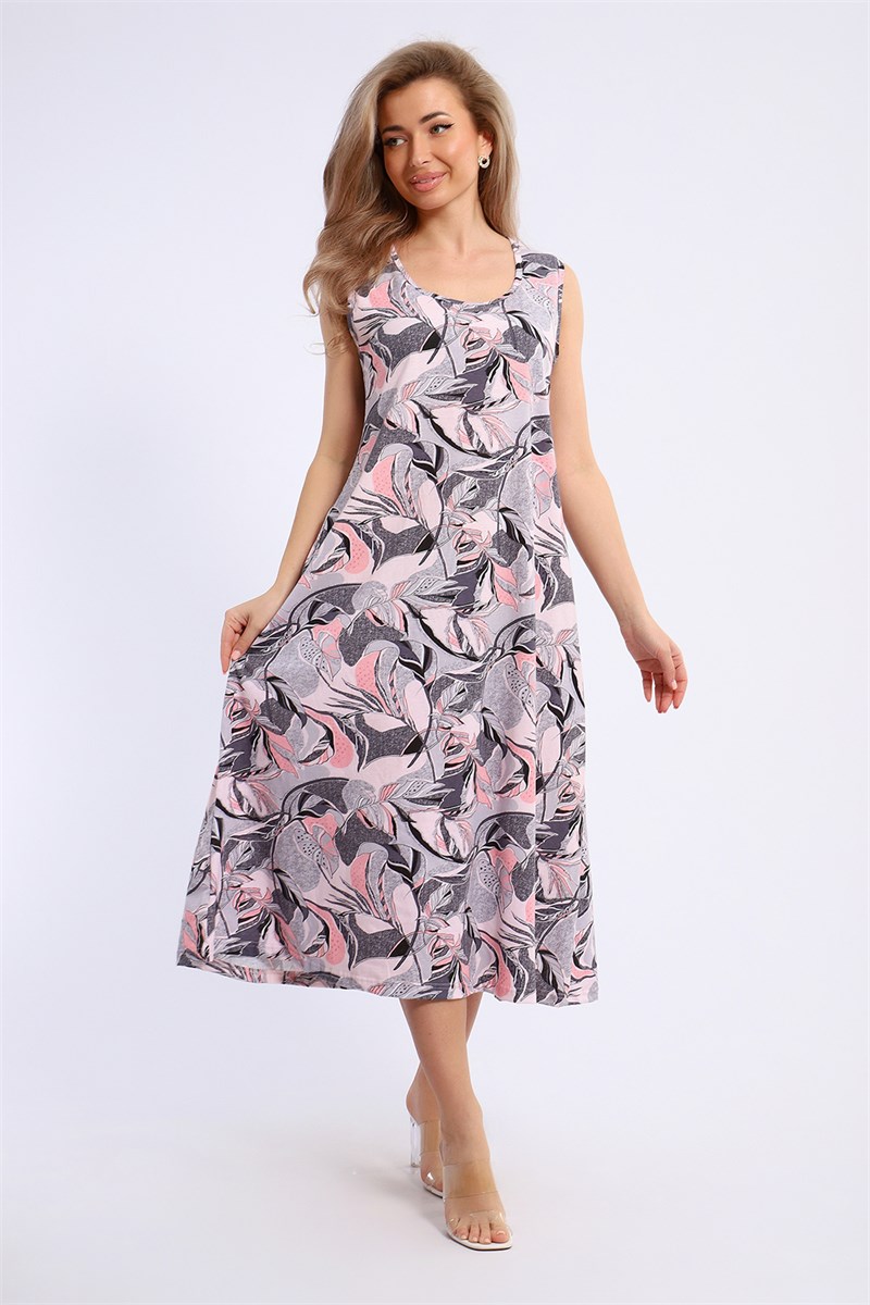 Платье без рукавов из хлопковой кулирки, свободное длинное, расклешенное. Орнамент на полотне с нежным сочетанием розового и дымчатого оттенков.