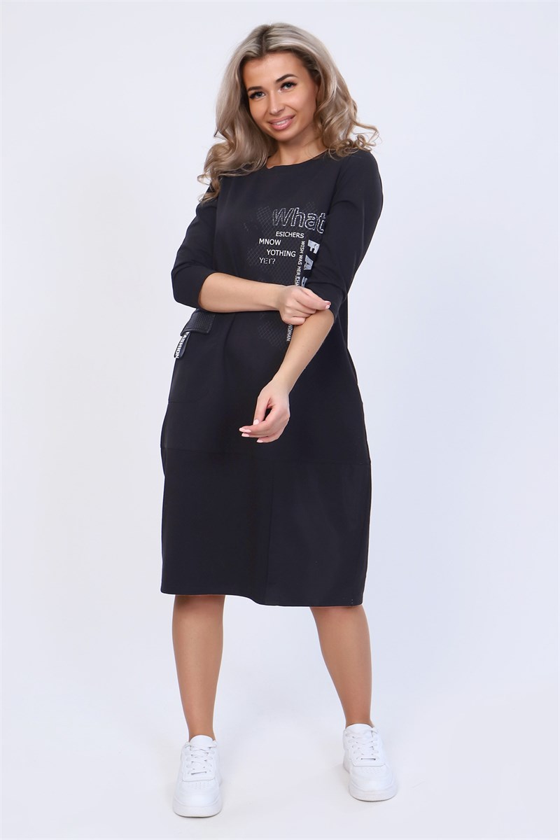 Модное женское платье в стиле оверсайз подойдет на любой тип фигуры. Главная изюминка платья - декоративный карман из кожи и большой, красивый принт спереди. Рукав 3/4, длина ниже колена, карман в боковом шве - прекрасный вариант для тех, кто любит уютную и удобную одежду.