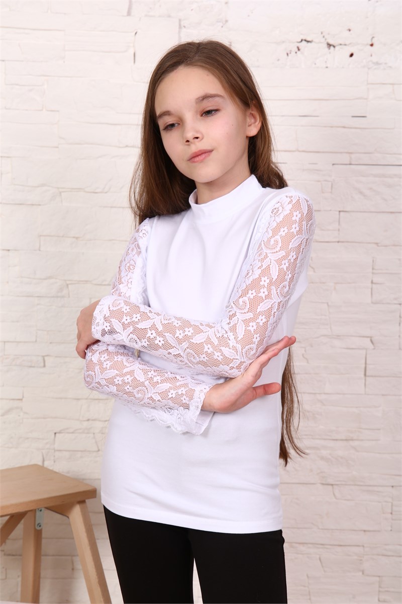 Блузка для девочек младшего и старшего школьного возраста, из однотонного трикотажного полотна кулирка с лайкрой. Блузка полуприлегающего силуэта, с втачным рукавом, без застежки, с воротником - стойкой. Спереди и на спинке отсутствуют линии членения. Рукав одношовный с кружевной вставкой, длинный. Низ рукава без манжеты, подогнут.