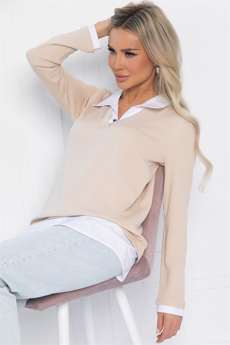 Джемпер из мягкого трикотажа украсит ваш деловой образ и сделает его красивым и комфортным. Сочетание двух видов ткани создаёт эффект многослойного образа. Рукав втачной, длинный. Отлично будет смотреться такой джемпер как с джинсами, так и с любым классическим низом. Воротник, низ изделия и манжеты на рукавах выполнены из хлопка.