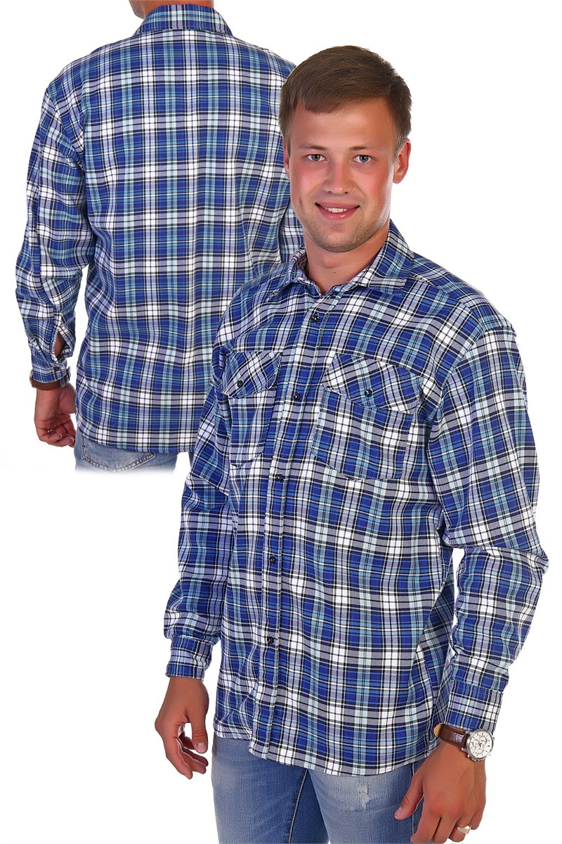 Мужская рубашка в клетку с длинным рукавом. Ткань фуле - ворсовая 100% хлопок. Модель свободного кроя, дополнена двумя накладными карманами и клапанами с пуговицами. Планка на полочке цельнокроеная, застегивается на пуговицы. Плечо приспущено, рукав до запястья на манжете. Воротник на стойке, проложен флизелином с отстрочкой. Низ изделия застрачивается швом в подгибку при помощи специального приспособления. Внимание ! Данный товар по цвету не подбирается.