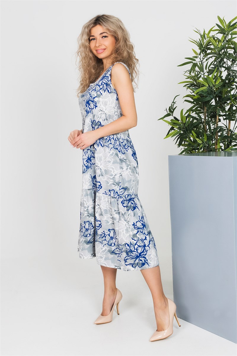 Сарафан женский из кулирного трикотажного полотна, свободной формы, расширенного к низу силуэта. По низу сарафана широкая оборка. Горловина (округлой формы) и проймы окантованы. Без карманов.