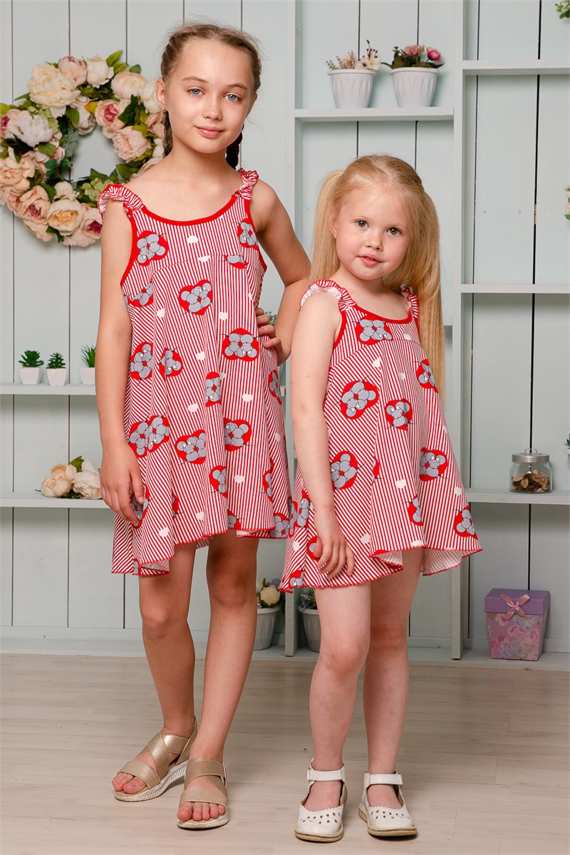Сарафан детский летний, свободного силуэта с завышенной линией талии. Бретели выполнены из основной ткани собранной на тонкую резинку. Низ изделия обработан декоративной краеобметочной строчкой.