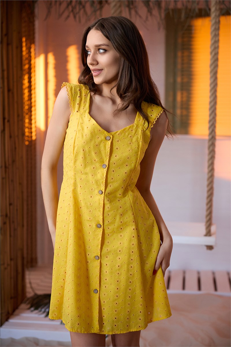 Сарафан приталенный, расклешенный к низу, на бретелях, с V-образной горловиной спереди, длиной выше колена. Застежка на пуговицы. Внутри сарафан на хлопковой подкладке, благодаря которой верхний слой ткани не просвечивает