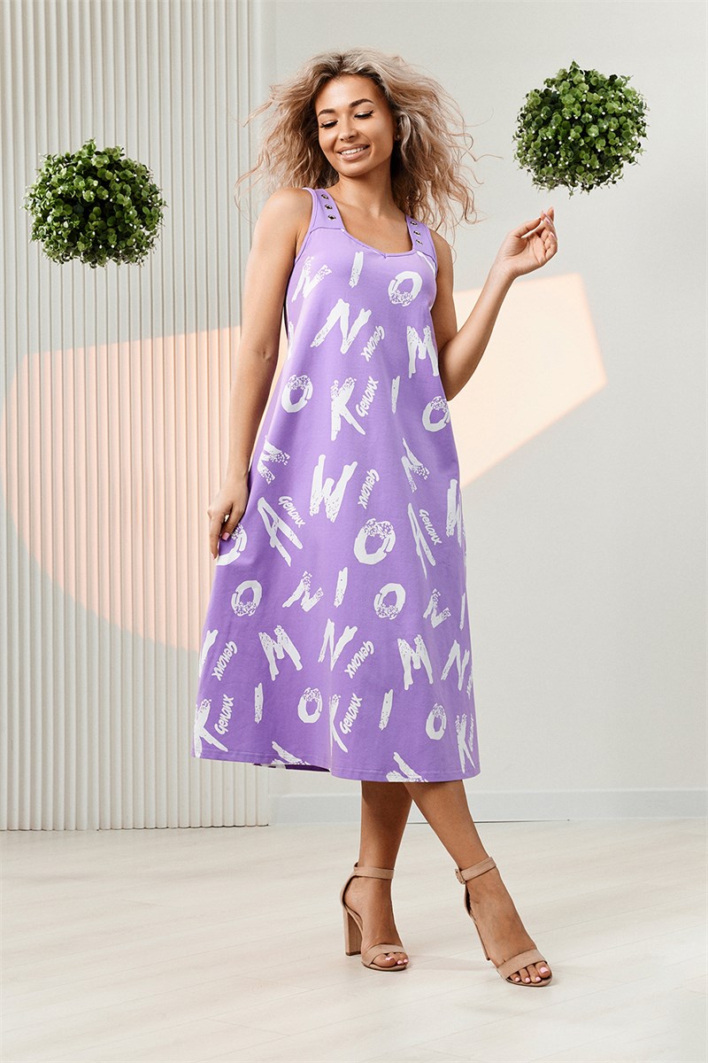 Сарафан трапециевидного силуэта, с V-образной горловиной, длиной ниже колена. В нижней части боковых швов обработаны разрезы. Горловина и проймы обработаны бейкой из основного полотна.