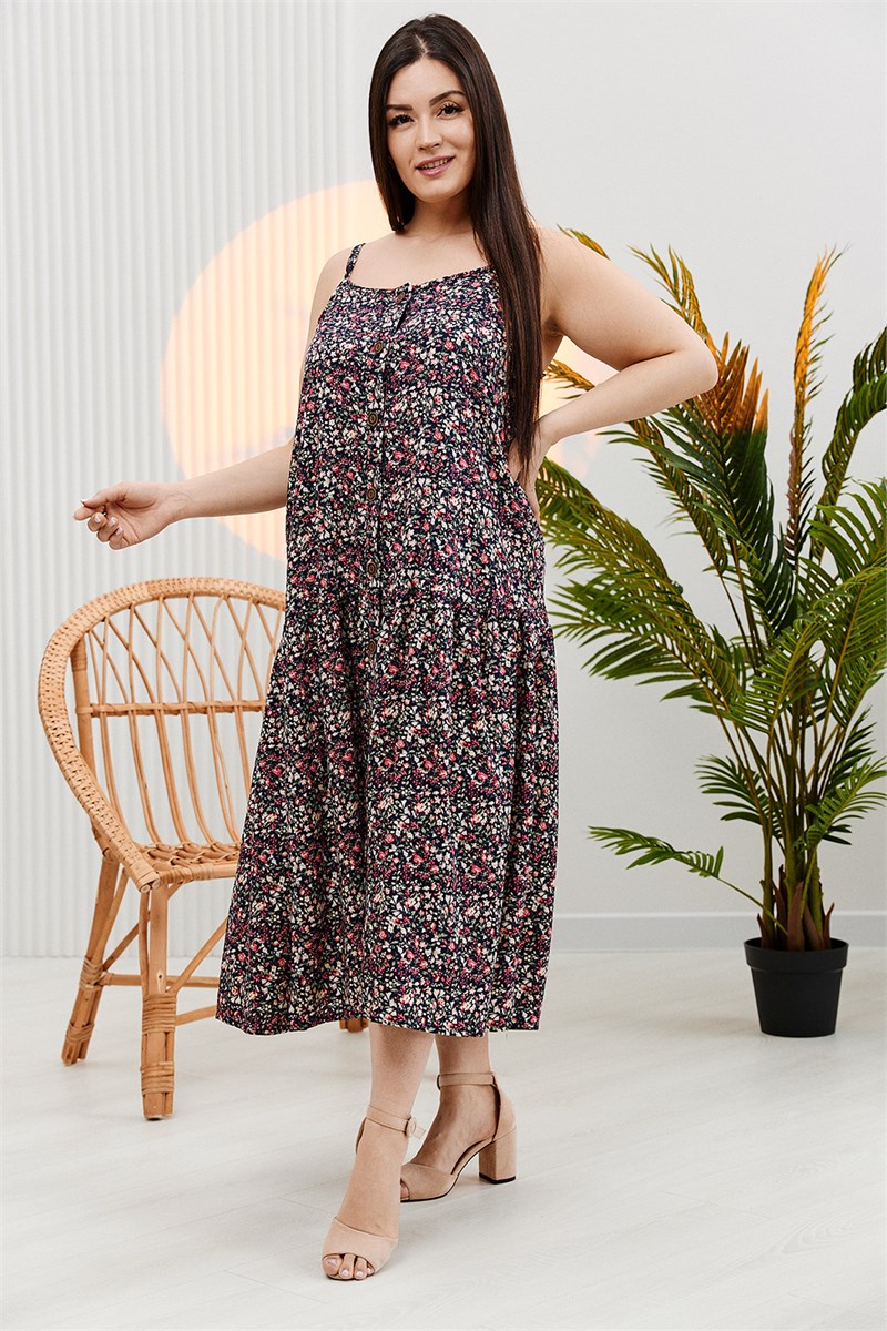 Сарафан женский, расклешенный к низу за счет сборки по линии бедер нижней части полочки и спинки. Спереди планка, застежка на петли - пуговицы. Бретели двойные. В боковых швах внутренние карманы. В лекалах учтена незначительная усадка ткани после стирки.