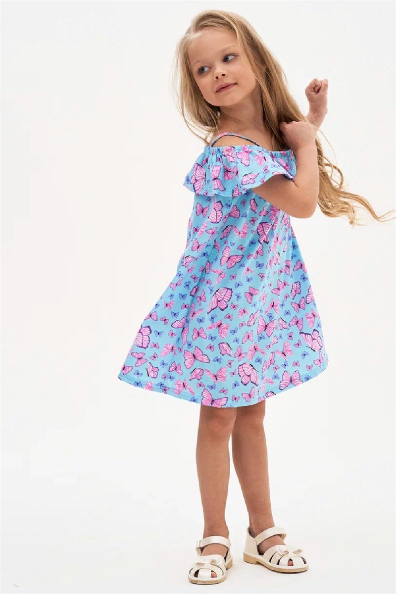 Детский стильный сарафан для девочек в яркой весенне-летней расцветке с насыщенными рисунками в голубых тонах. Современная модель, модный крой.