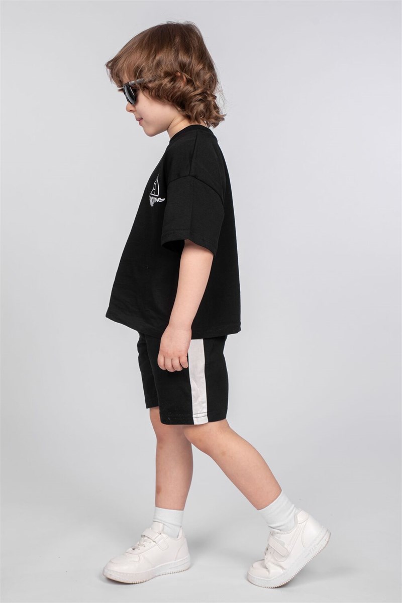 Шорты для мальчика прямого силуэта. Пояс отрезной в цвет изделия, выполнен из кашкорсе, с эластичной тесьмой внутри. По поясу шорт вставлен плоский утягивающий шнурок, в цвет изделия. По боковому шву втачаны лампасы. Низ изделия обработан швом в подгибку. В боковом шве карман с отрезным бочком.