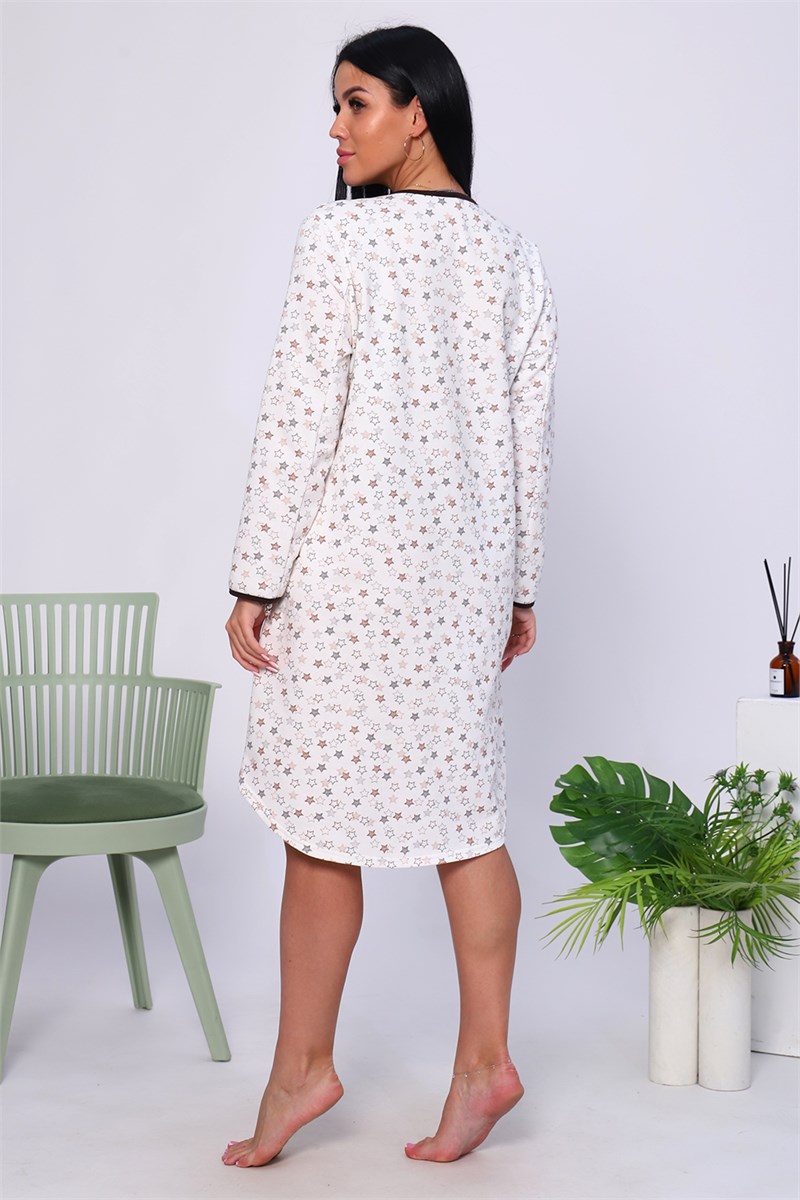 Тёплая уютная сорочка из футера с начесом. Слегка приталенный силуэт, длина чуть ниже колена, комфортный длинный рукав, округлый вырез горловины. Низ рукава и горловина обработаны контрастной окантовкой. Подол изделия подогнут на плоскошовной машине.