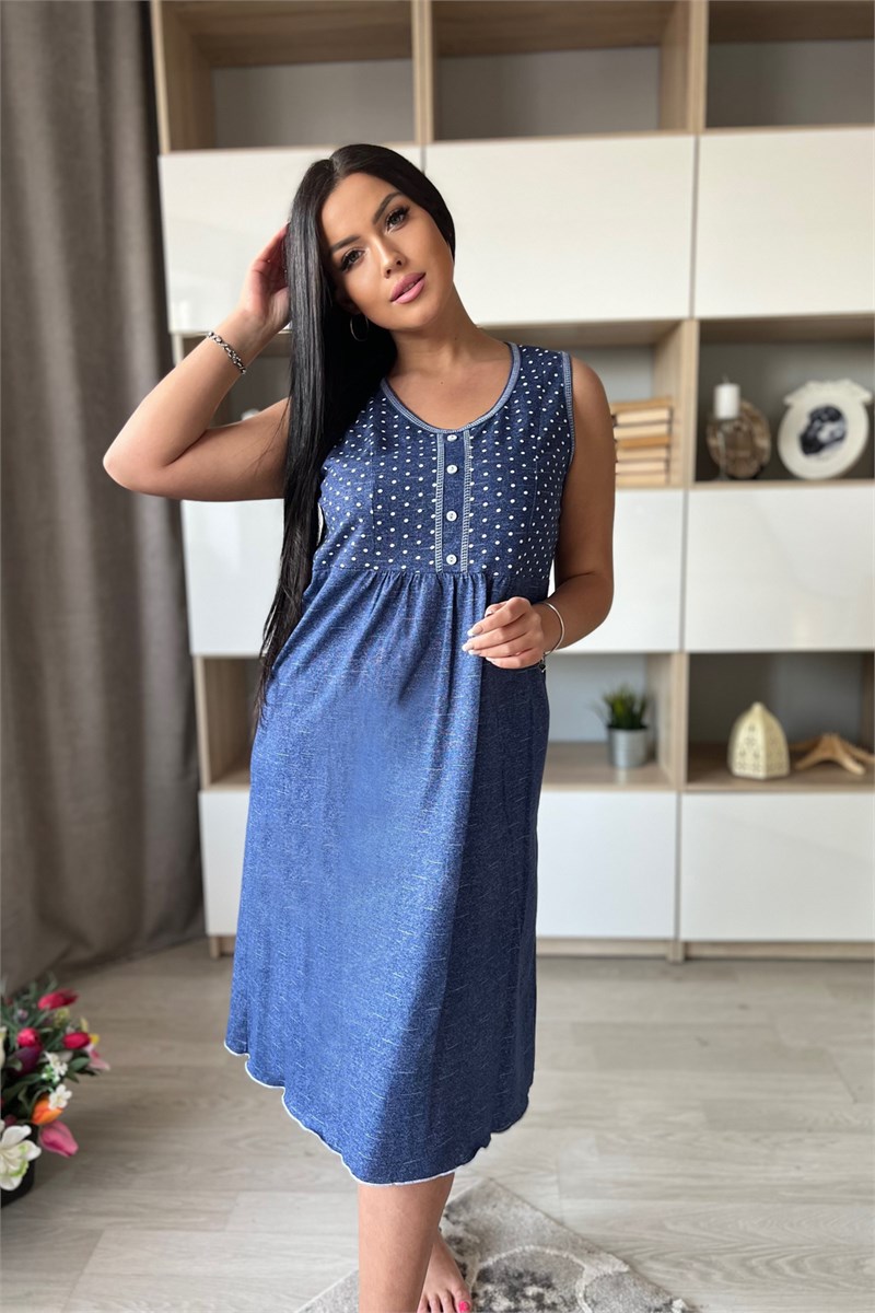 Сорочка женская прямого силуэта, без рукава. В верхняя часть сорочки из отделочной ткани, с рельефами, на планке три пуговицы. Для обеспечения достаточной свободы нижняя часть полочки со сборкой.