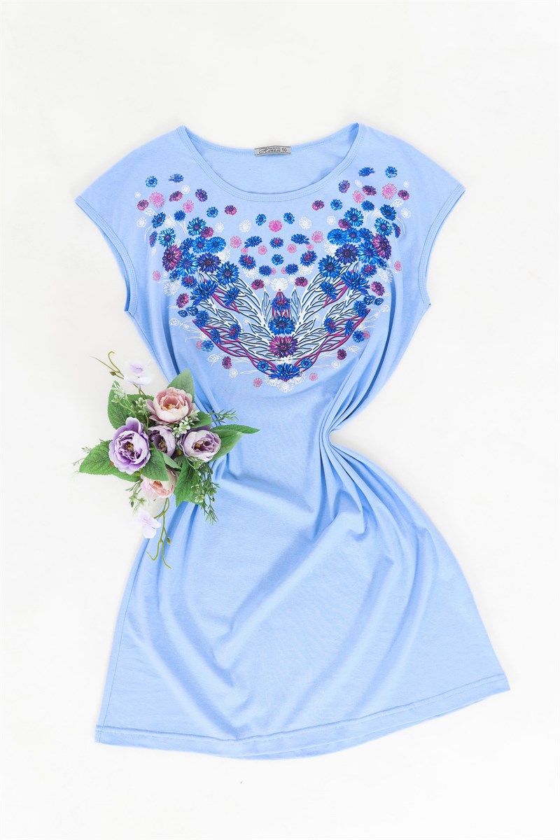 Нежная сорочка с красивым васильковым принтом. Очень удобный крой. Спущенный рукав, горловина-лодочка.