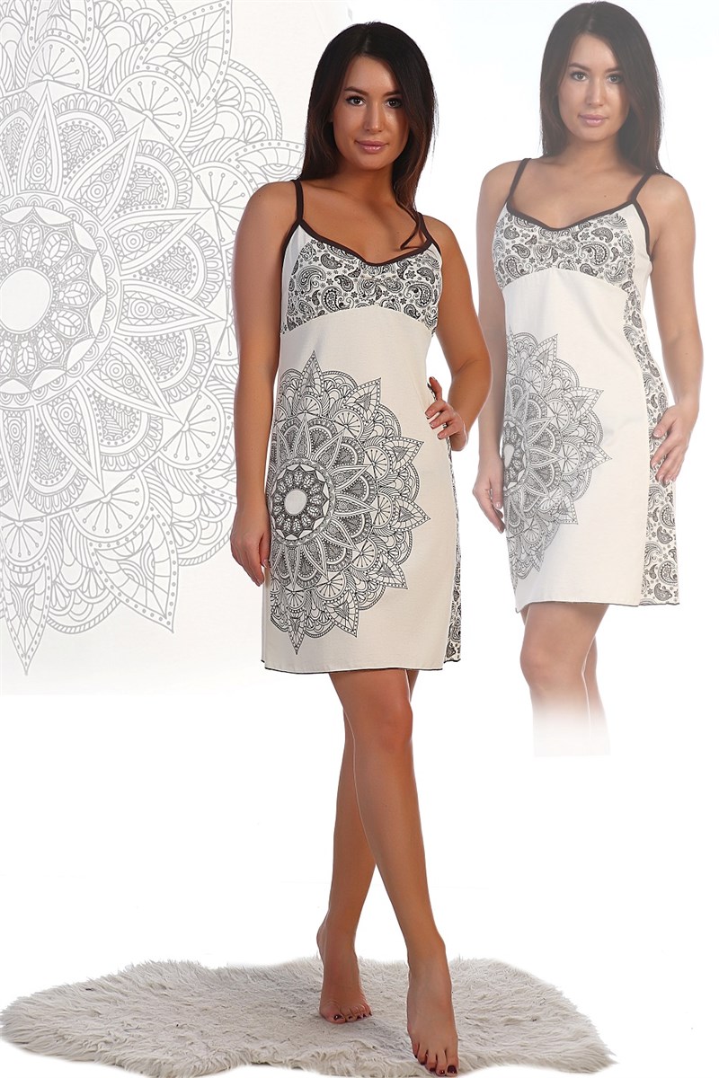Сорочка из кулирки. Дизайн в виде этнических узоров. Тонкие лямки, темная окантовка. Общая чуть выше коленей. Размеры от 42 до 60. Есть возможность приобрести данный товар в розницу.