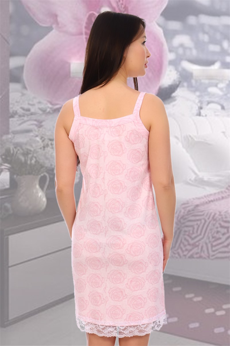 Сорочка на широких лямках в светло-розовых тонах. Под грудью и по низу пришивное белое кружево. Подходит для сна и домашнего отдыха.