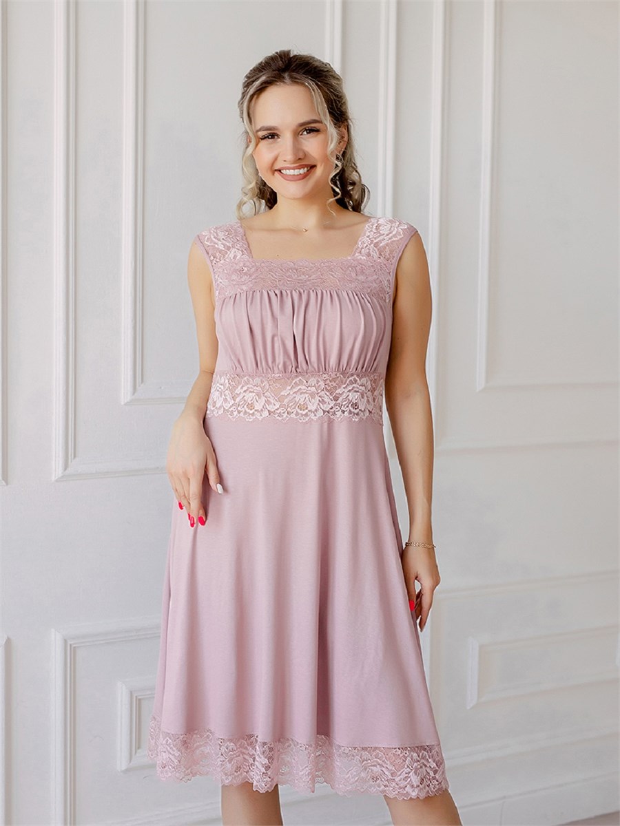 Ночная сорочка женская с кружевом из вискозы прямого силуэта, расклешенная к низу от груди, длиной до колена, на широких кружевных бретелях. На детали переда выполнена двойная кокетка, верхняя кокетка задрапирована. Благодаря двойной кокетке и драпировке, очень хорошо поддерживает грудь. Сорочка декорирована эластичным кружевом под кокеткой, по горловине, проймам и низу. Ночная рубашка женская вискоза (ночнушка) из нежнейшей вискозы премиум качества. Ночная сорочка представлена большим размерным рядом с 42 по 56 размер. Идеальная посадка ночной рубашки будет идеально смотреться на любой фигуре. Вискозное волокно, содержащие эластан, не подвержено усадке после стирки и при правильном уходе долго сохраняет форму. Воздухопроницаемость материала гарантируют комфортный сон, сорочка очень удобна в носке дома или на даче. Рубашку можно использовать как сорочку и как одежду для дома. Ночная сорочка женская из вискозы выглядит как вечернее платье. Натуральная шелковистая ткань, которая позволяет коже дышать, превращает сорочку в комфортную одежду для дома. Эластичное и эффектное кружево добавляет ночнушке сексуальности и романтичности. Домашняя одежда для женщин должна быть красивой и сексуальной. Ночнушка трикотажная так же эффектно смотрится как шелковая ночная сорочка женская, но при этом намного практичнее. Приобретая нашу сорочку, вы получаете сразу два решения: эффектное платье для дома и сорочку для комфортного сна. Вискоза отлично тянется, а это значит, что ночная сорочка подойдет для беременных и кормящих, возьмите ее с собой в роддом. Ночная рубашка подойдет на большие размеры, девочкам, молодым девушкам и женщинам.