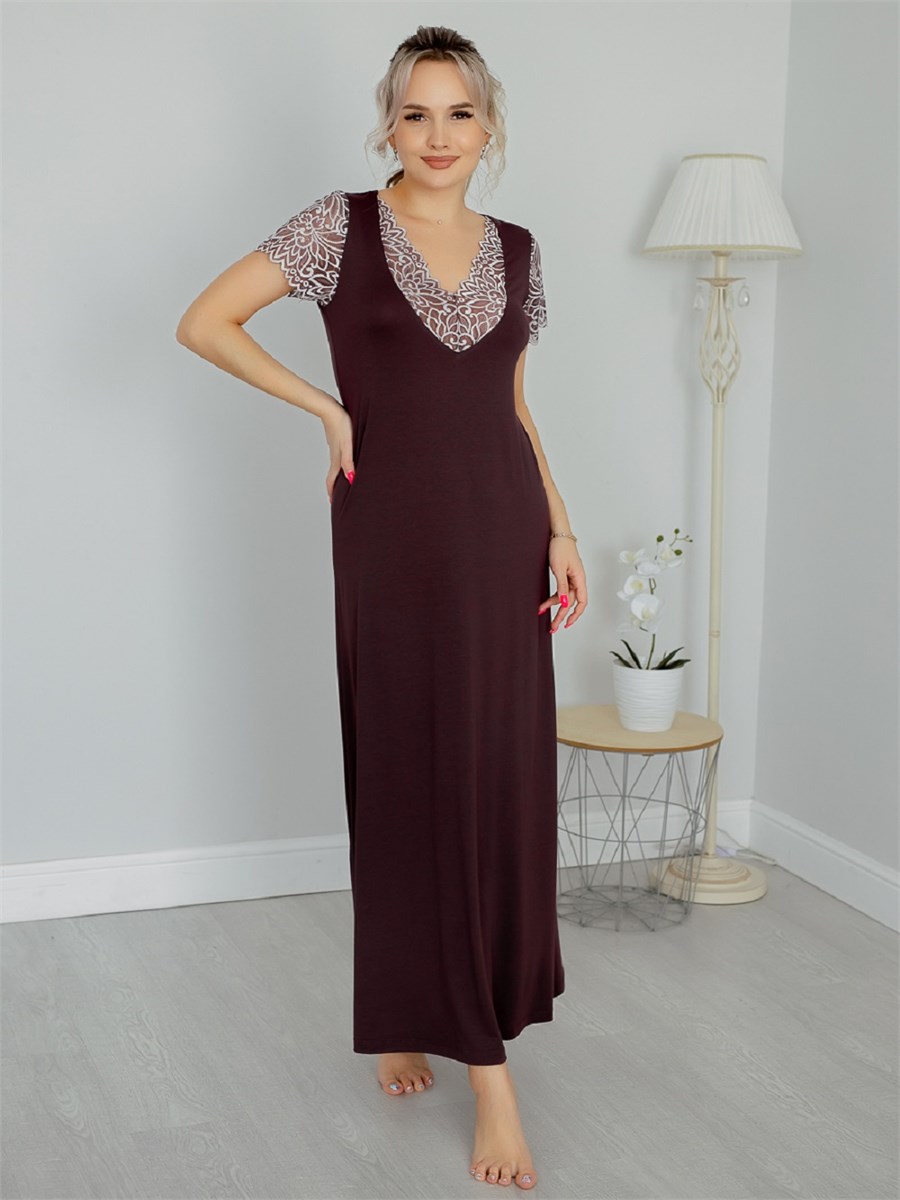 Ночная сорочка женская длинная из вискозного полотна. Ночная сорочка А-силуэта полуприталенного кроя. Эффектная и стильная сорочка для сна и отдыха отличный наряд для дома. Короткие рукава и глубокий вырез горловины сделаны из эластичного кружева. Кружевной вырез эффектно подчеркивает зону декольте. Рубашка длинная, поэтому подойдет и на высоких. Состав ткани 92 % вискоза и 8 % эластан. Ночную сорочку удобно надеть и для сна и использовать как домашнее платье. Ночная рубашка представлена большим размерным рядом, в продаже размеры с 44 по 62. Натуральная шелковистая ткань позволяет коже дышать, превращает сорочку в комфортную одежду для дома. Эластичное и эффектное кружево добавляет ночной сорочке сексуальности и женственности. Домашняя одежда для женщин может быть красивой и сексуальной. Вискоза отлично тянется, а это значит, что сорочка подойдет для беременных и кормящих, возьмите ее с собой в роддом и будете самой элегантной мамочкой.
