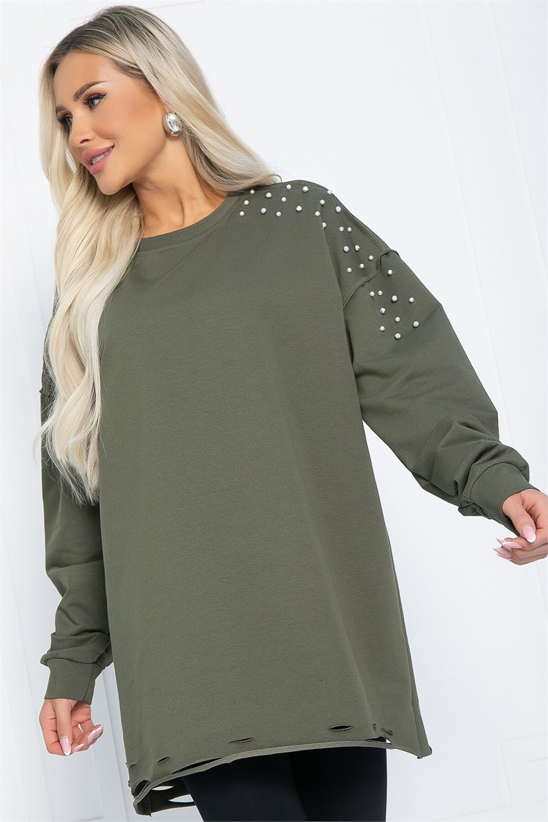 Стильный свитшот свободного кроя станет ярким акцентом в вашем гардеробе. Длинные рукава со спущенным плечевым швом обеспечивают максимальный комфорт и свободу движений. Декоративные бусины, которые расположенны по плечу, придают изделию уникальность и изысканность. Этот свитшот идеально подходит для повседневного ношения и создания модных образов.