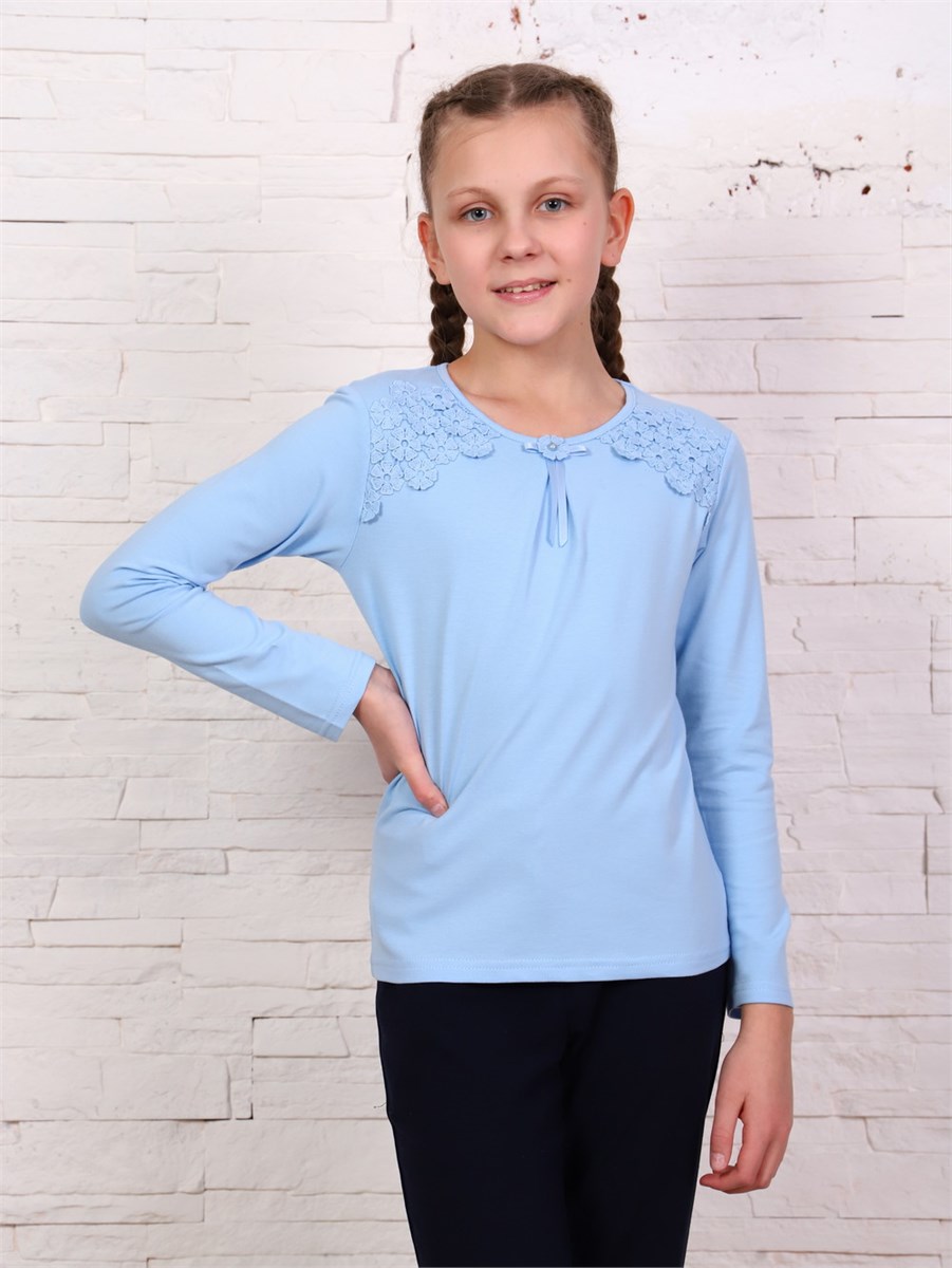 Блузка для девочек дошкольного, младшего и старшего школьного возраста, из однотонного трикотажного полотна кулирка с лайкрой. Блузка прямого силуэта, с втачным рукавом, без застежки. Спереди, по центру заложена встречная складка. На спинке отсутствуют линии членения. Срез горловины обработан узкой окантовочной лентой из того же полотна в 4 сложения. Рукав одношовный длинный. Низ рукава без манжеты, подогнут. На передней части джемпера настрочено кружево от горловины к проймам. По центру горловины приклеплен цветок с атласной ленточкой.