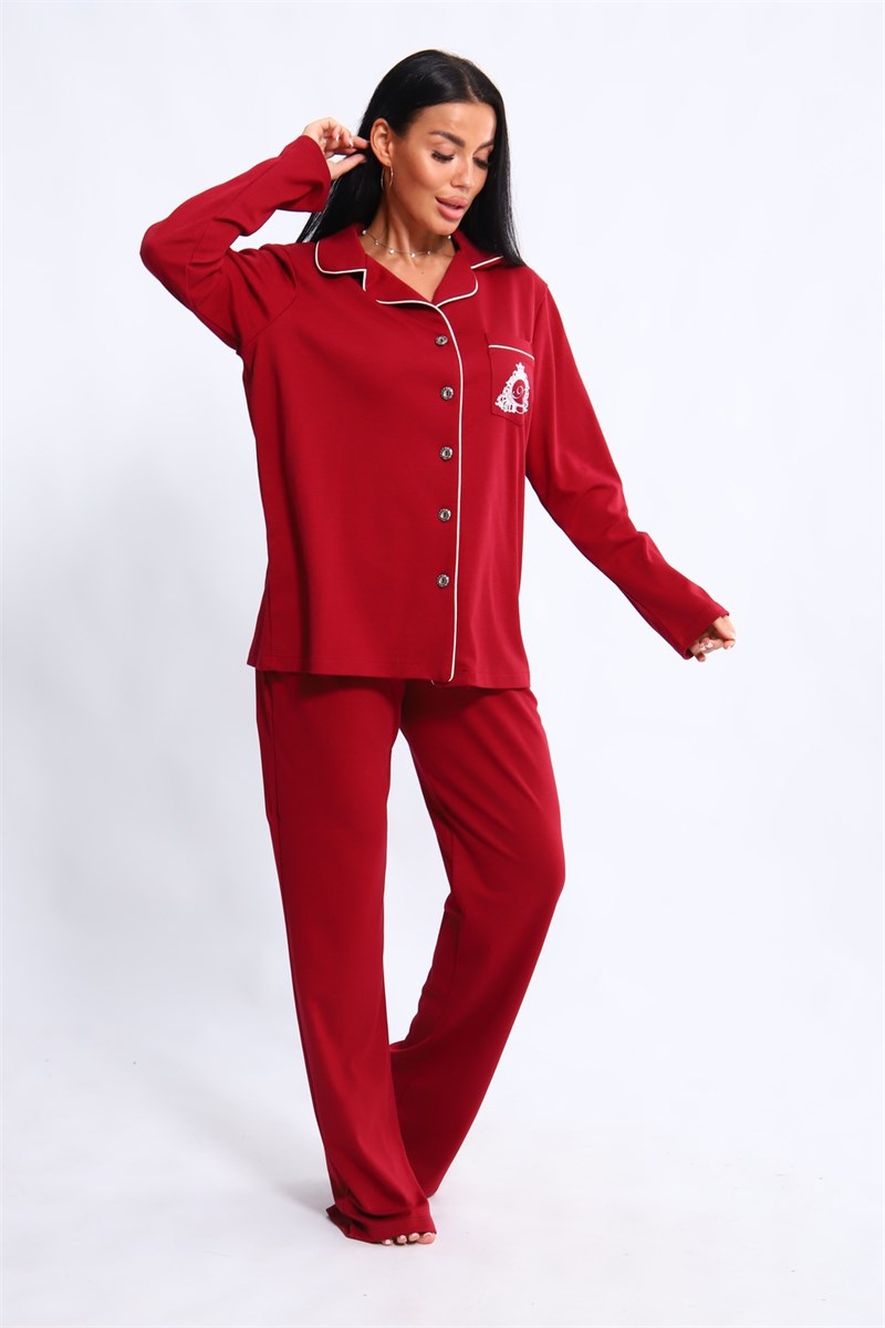 Пижама не приталенного силуэта на пуговицах с прямыми брюками и кофтой. Vобразный вырез с отложным воротом, рукав втачной, на кармане декоративная печать в стиле шелкографии.