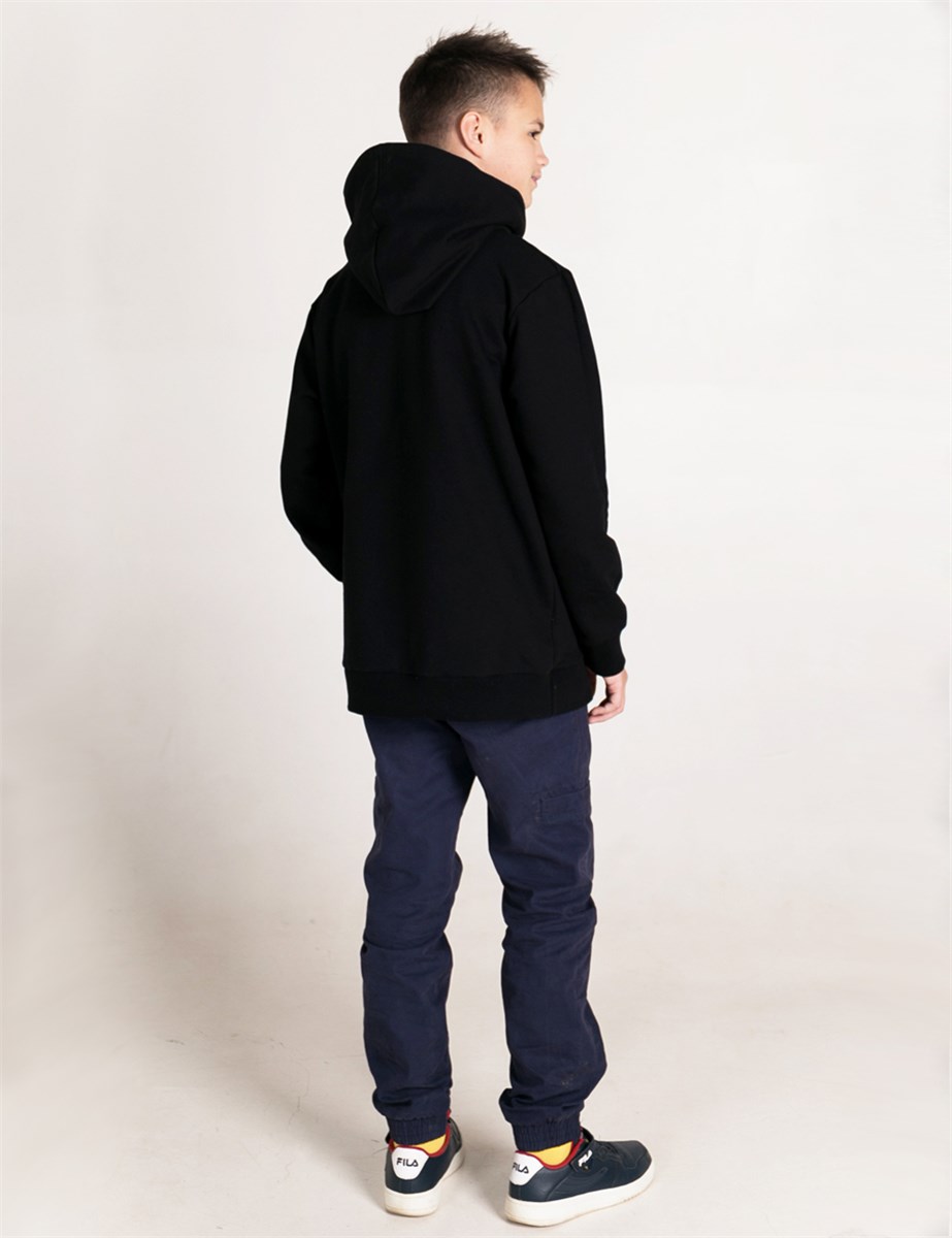 Толстовка из тёплого футера с карманом Кенгуру и капюшоном с балаклавой, трансформирующейся в удобную стойку. Полочка декорирована контрастной печатью.