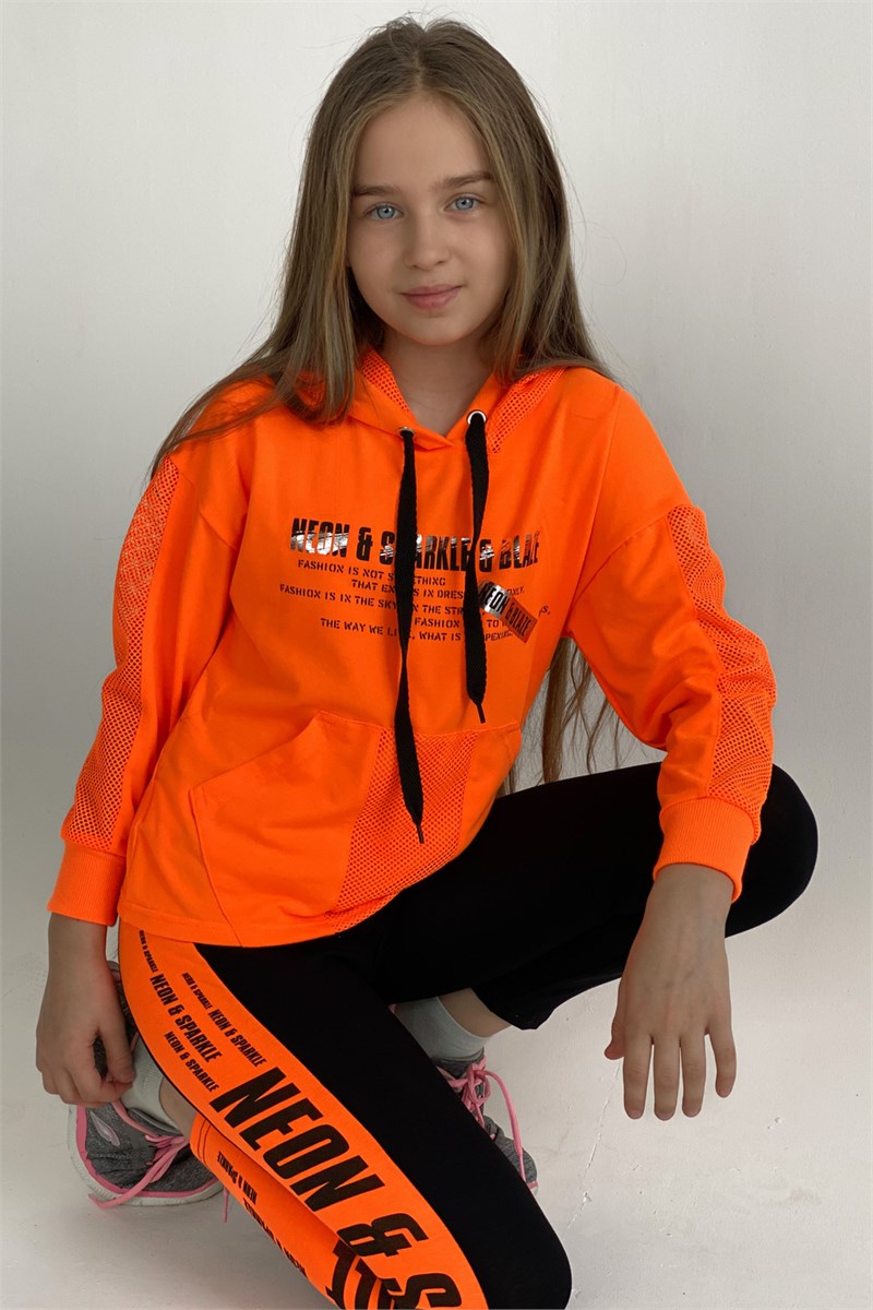 Толстовка прямая, свободная, с капюшоном из сетки, с удлиненной спинкой. Рукав длинный, со вставкой из сетки вдоль рукава, на эластичном манжете. На полочке расположен карман кенгуру.