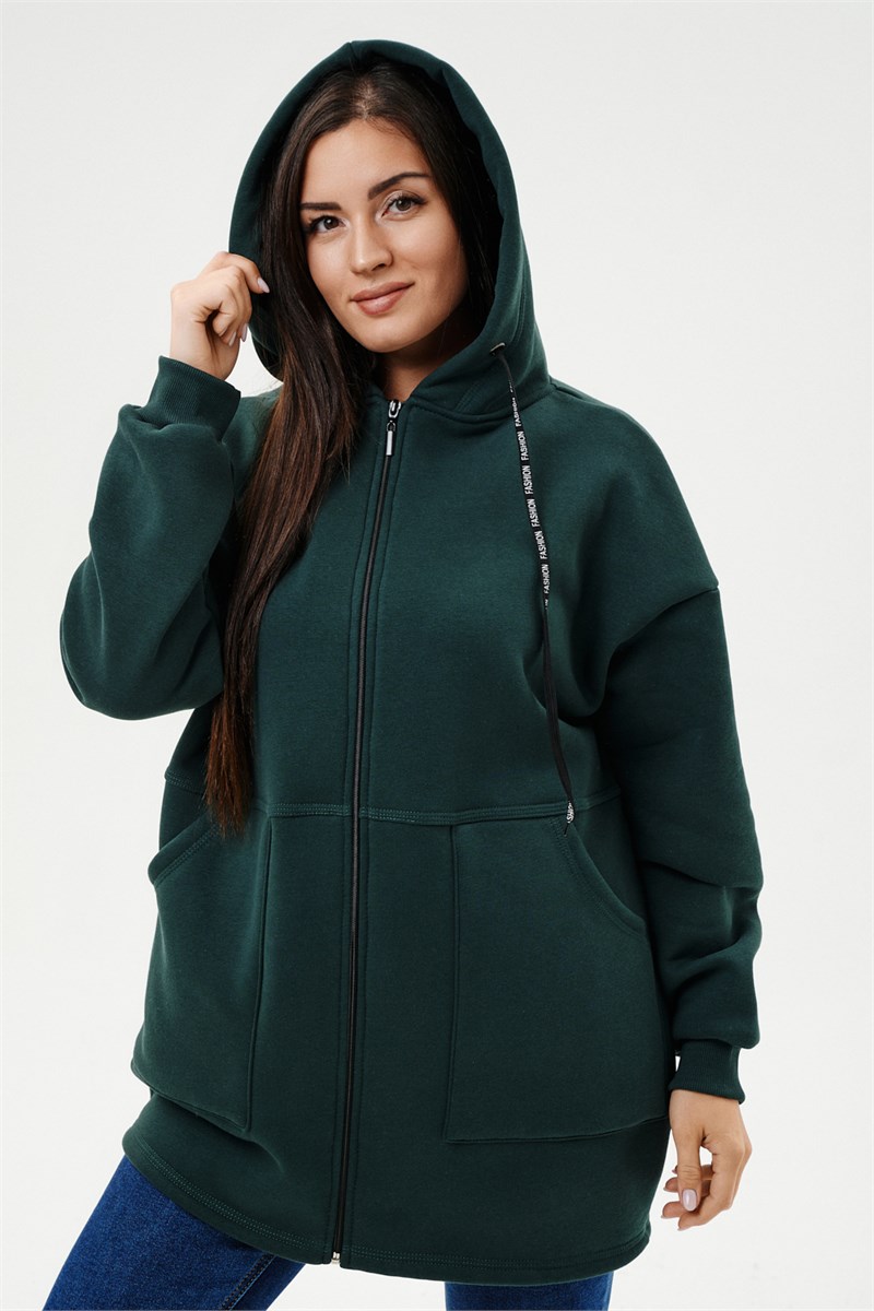 Толстовка женская прямого силуэта до линии бедер, в нижней части заужена по бокам. Рукав втачной с заниженной линией плеча, с манжетой. Капюшон с люверсами и декоративными шнурками. Застежка на тесьму-молнию. В нижней части полочки два накладных кармана.