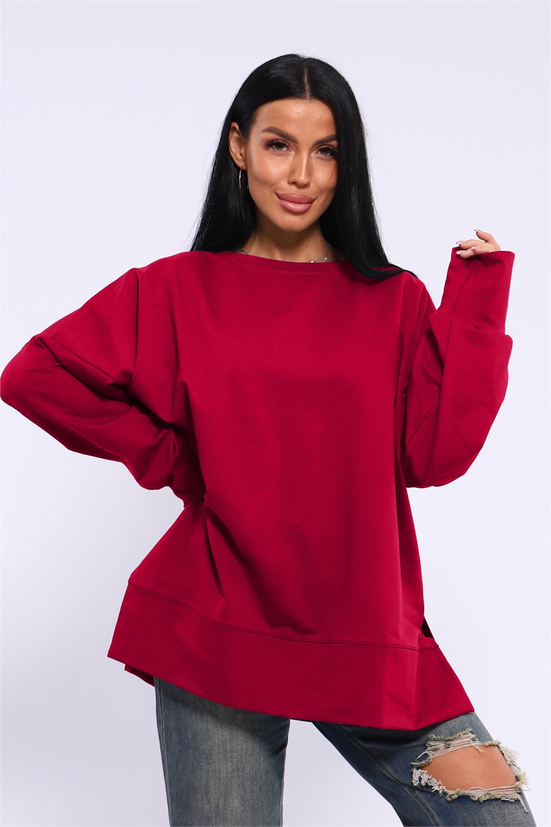 Яркая худи свободного кроя без капюшона. Рукав спущенный, имеется карман-кенгуру и разрезы по бокам.