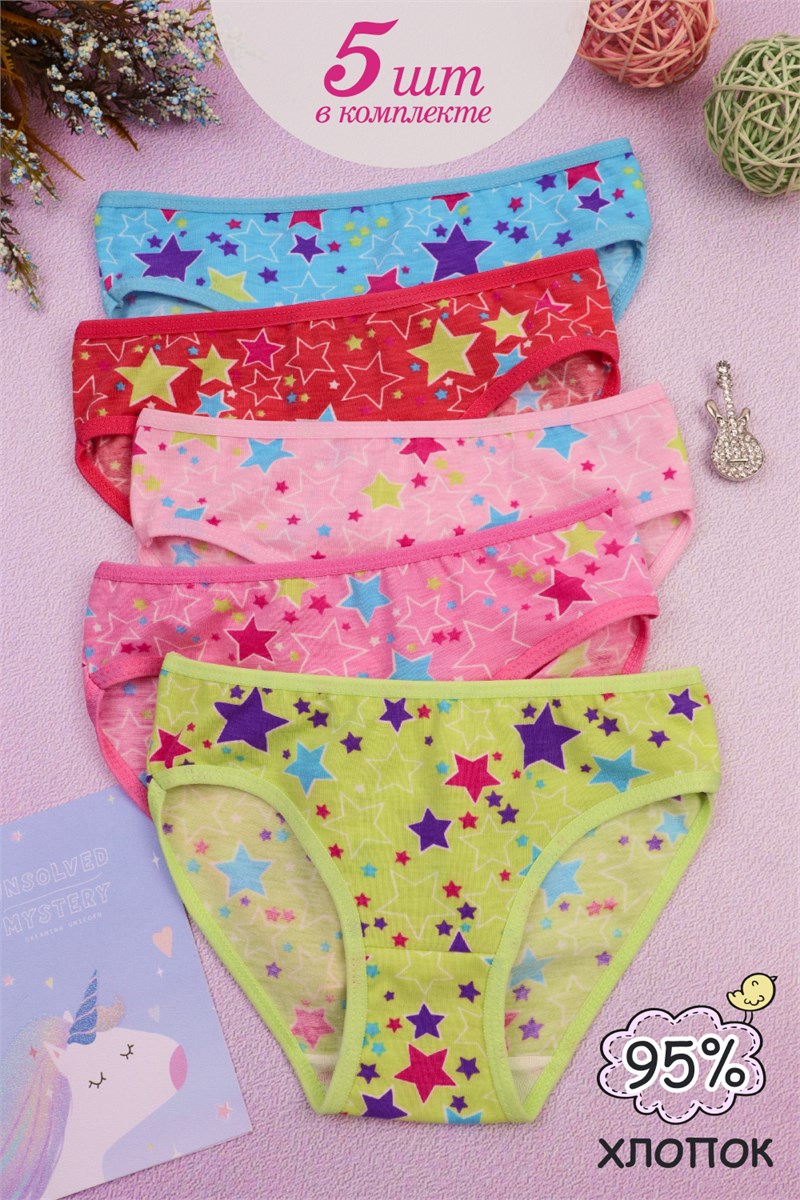 GL80 Трусы на девочек Звездочки выполнены из 95% хлопка и 5% спандекс. Мягкая резинка, плоские швы. 5 шт. в упаковке - одинаковый рисунок, несколько цветов. В каждой упаковке минимум 3 цвета. Очень яркий комплект. Множество вариантов принтов со звездочками и разнообразные расцветки - могут незначительно отличаться от представленных на сайте. Производство Китай.