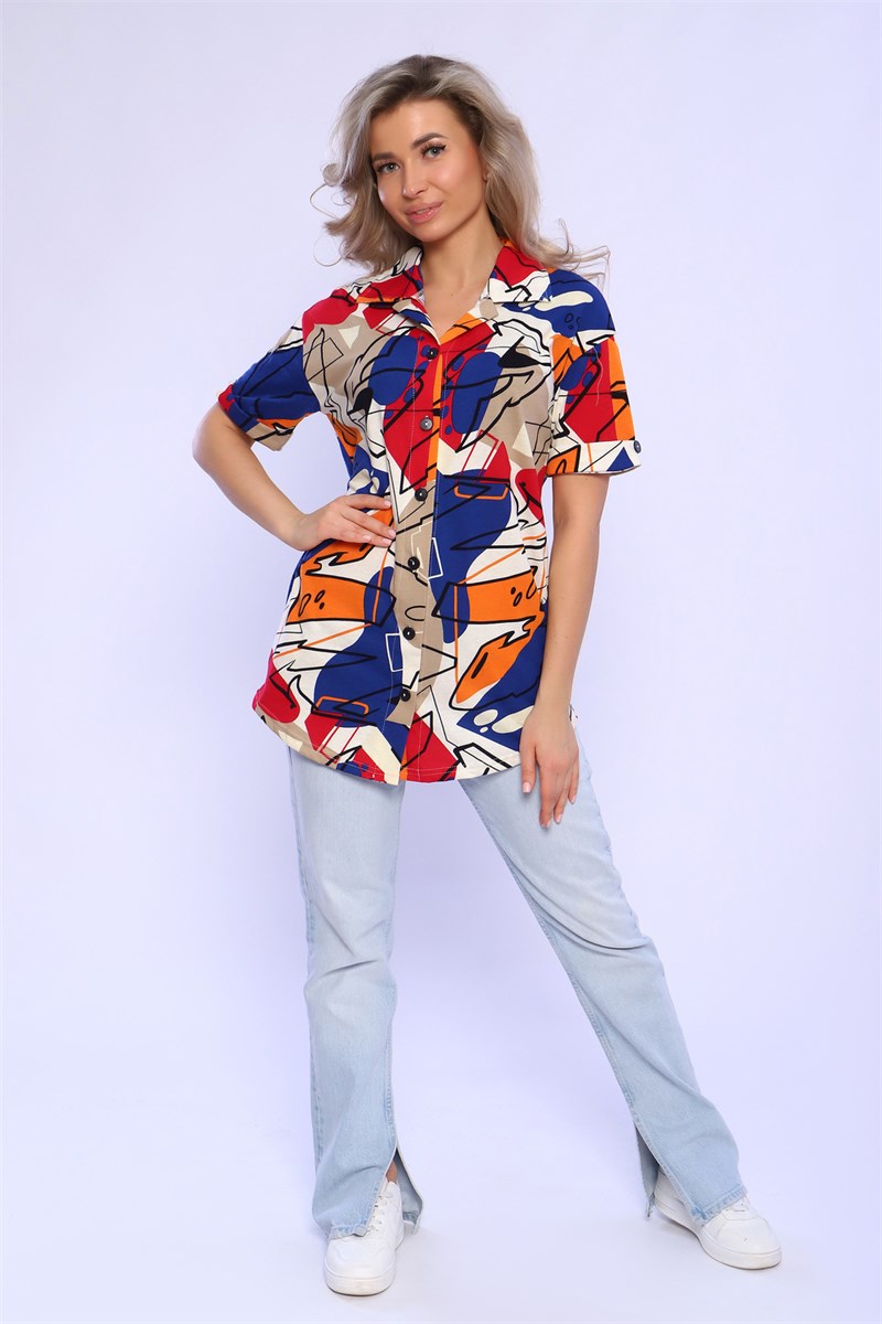 Туника полуприлегающего силуэта на пуговицах и рубашечным воротником. Короткие рукава с отворотными манжетами, закрепленными пуговицами. Карманы в боковых швах. Низ изделия полукруглый с удлиненной спинкой.