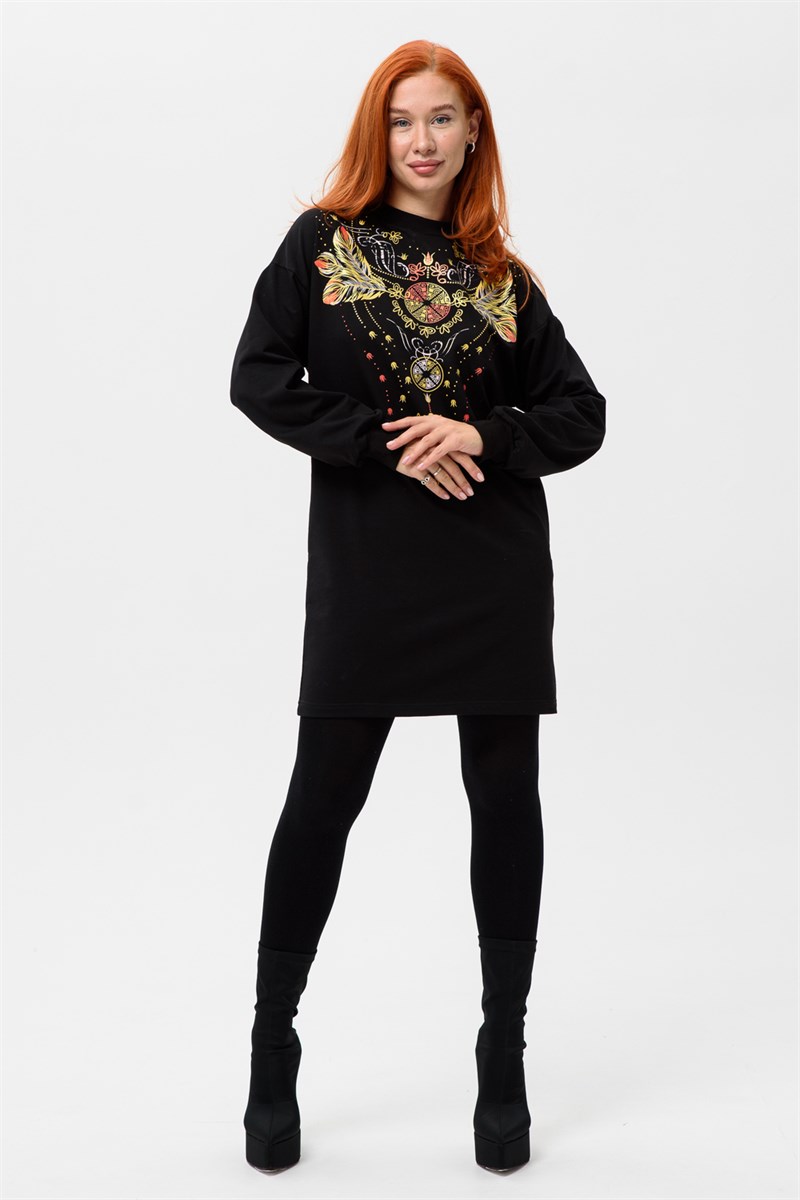 Современная молодёжная туника свободного кроя с сильно спущенной проймой и удлиненным рукавом на манжете. Принт - оригинальный орнамент с использованием золотого глиттера. В боковых швах внутренние карманы. Горловина и манжеты выполнены из качественной ткани кашкорсе.