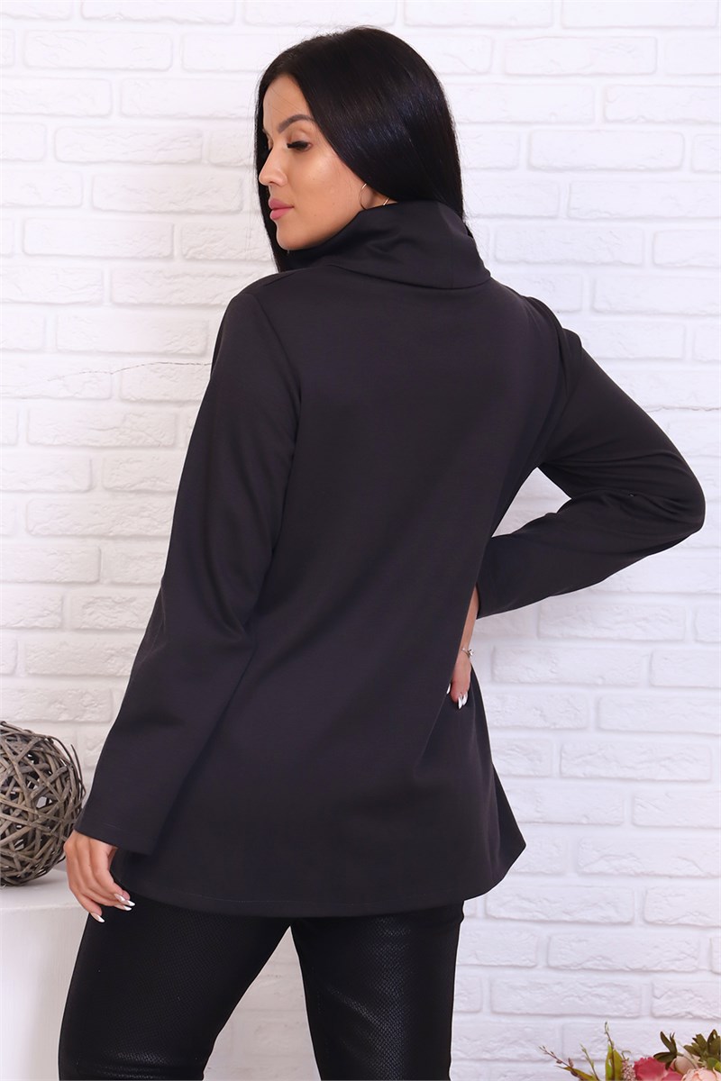 Туника свободного кроя. Рукав длинный. Ворот-хомут. На полочке снизу разрез на декоративной молнии. Нашивной карман.