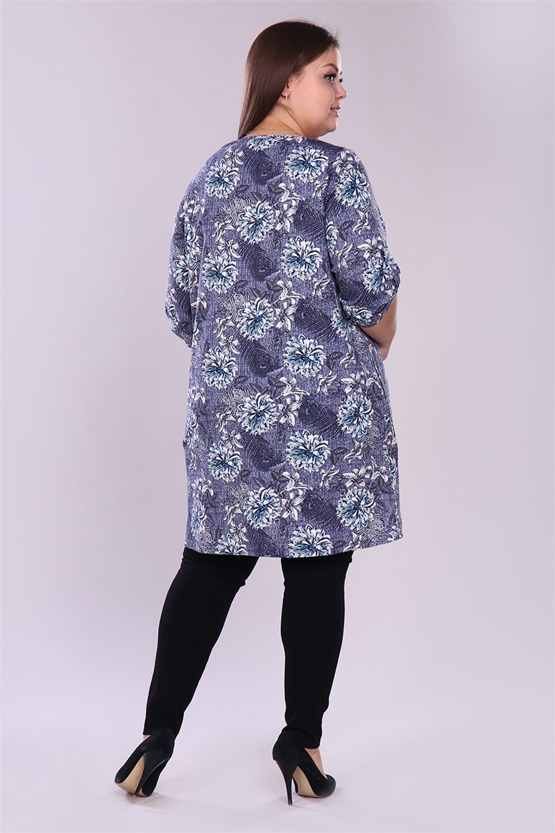 Удлинённая женская туника свободного кроя выполнена из 100% хлопчатобумажного полотна. По горловине расположен треугольный вырез, рукав 3/4. На рукавах имеются паты, закреплённые светлыми серебристыми пуговицами, что делает изделие более привлекательным. Данная туника для полноразмерных дам помогает скрыть недостатки фигуры и подчеркнуть достоинства, тем самым создавая стильный образ, в котором Вы будете чувствовать себя максимально комфортно и уверенно. На модели 52 размер
