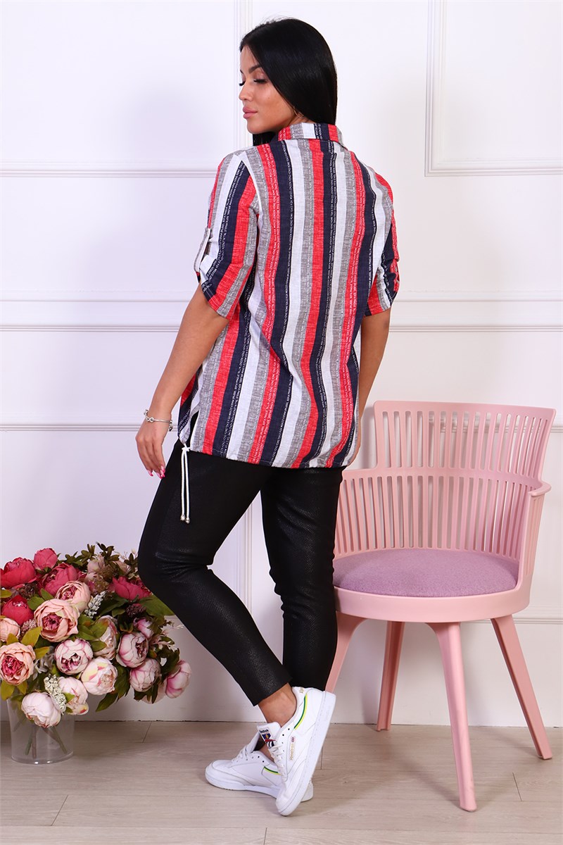 Женская стильная туника рубашечного плана из 100% хлопчатобумажного полотна в полоску. Рукав 3/4 с патами на кнопках, горловина с отложным воротником и втачной V - образной планкой с отделкой из кнопок. Низ изделия на шнурке. Яркая контрастная полоска является одним из модных вариантов расцветки рубашки-туники. Лаконичной такую модель не назовёшь так как выглядит она ярко и стильно, и к тому же она зрительно стройнит и вытягивает фигуру.
