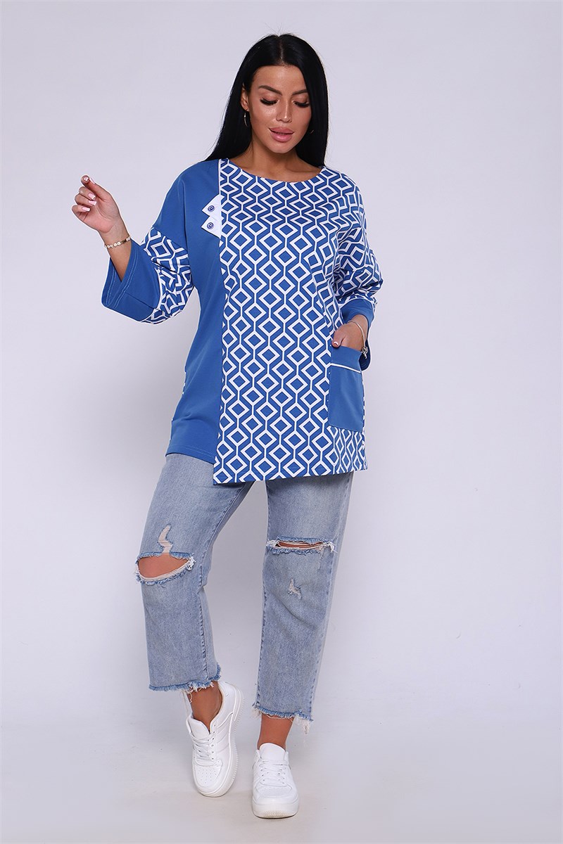 Стильная женская туника из комбинированного футера со спущенным плечом. Рукав 3/4 с отделочной деталью по низу. На полочке накладной карман. Декор - пуговицы. Можно комбинировать как с брюками, так и с юбкой.