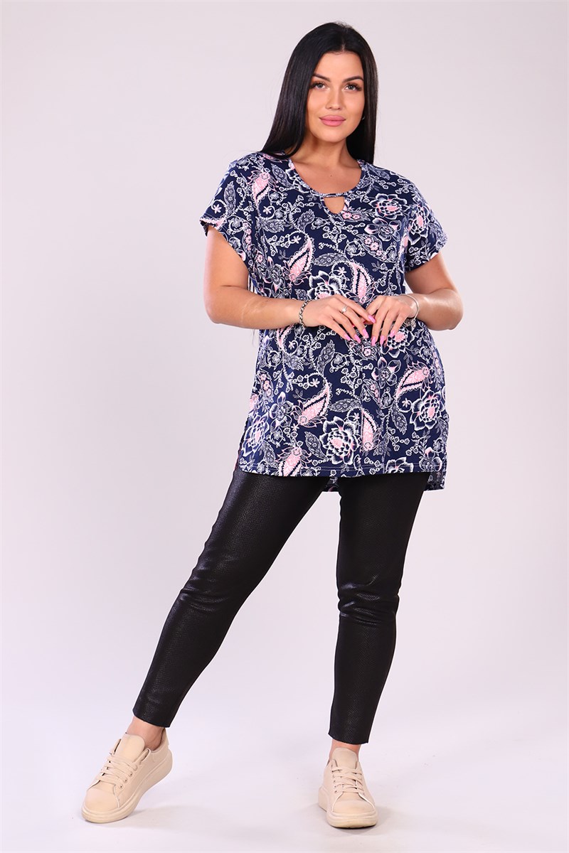 Туника женская прямого силуэта, короткий рукав. Горловина круглая, капелька на полочке отделаны бейкой. Туника удлиненная, по боковым швам разрезы. Туника с цветочным орнаментом подойдет к любому низу. Прекрасный вариант для повседневной носки.
