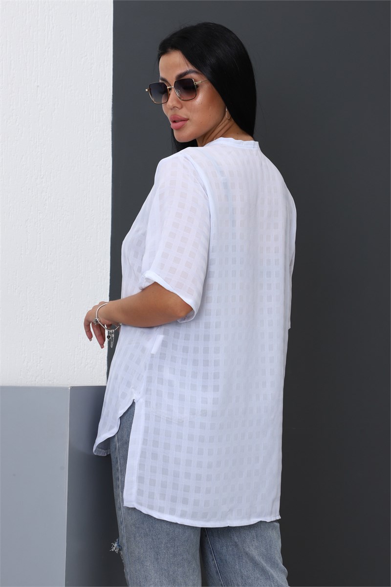 Туника летняя женская, расклешенного типа, рукав 3/4,округлый воротник, задняя полочка длиннее передней. Легкая и удобная.