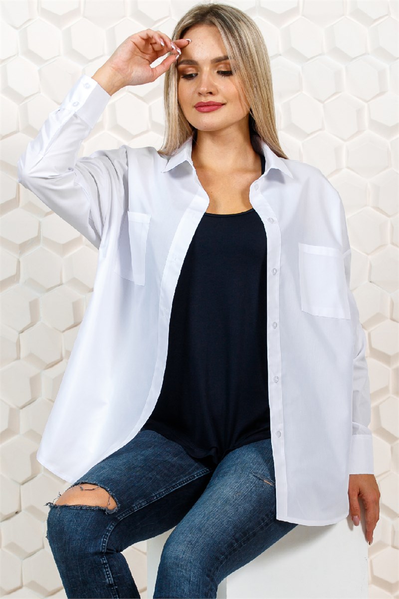 Туника рубашечного кроя, оверсайз, с длинным рукавом. Фигурный низ, застегивается на пуговицы, два нагрудных кармана.