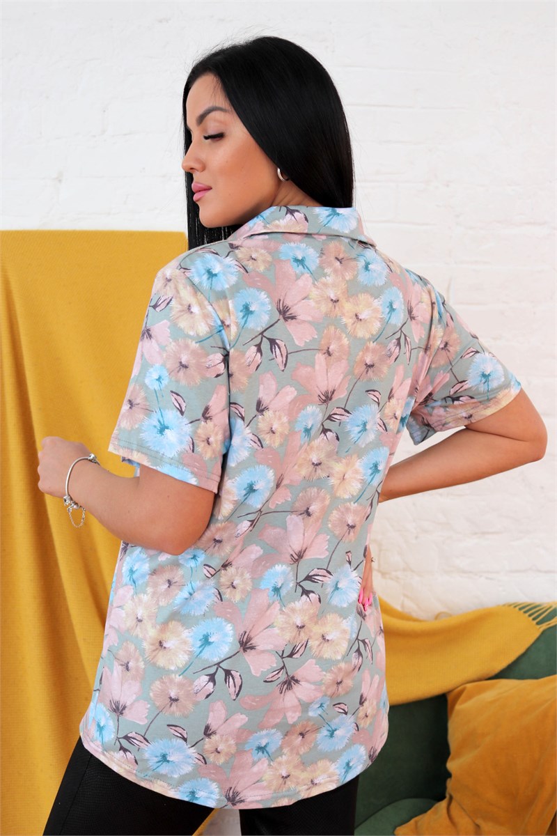 Туника женская на пуговицах выполнена из ткани кулирка оригинальной расцветки в виде нежных цветов. Воротник рубашечный, правая сторона планка из отделочной ткани. Рукав короткий. Низ с небольшим закруглением. Туника подойдет для прогулок и отдыха.