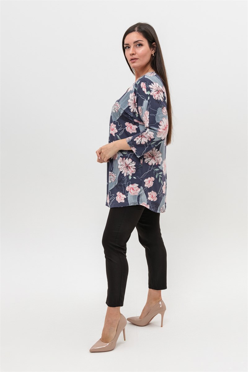 Туника женская со спущенным цельнокроеным рукавом длиной 3/4 выполнена из вискозы красивой, нежной расцветки. Горловина туники имеет V-образный вырез, обработана планкой, низ изделия немного расклешен. Ткань хорошего качества, при стирке не линяет, не дает усадку, сохраняет форму.