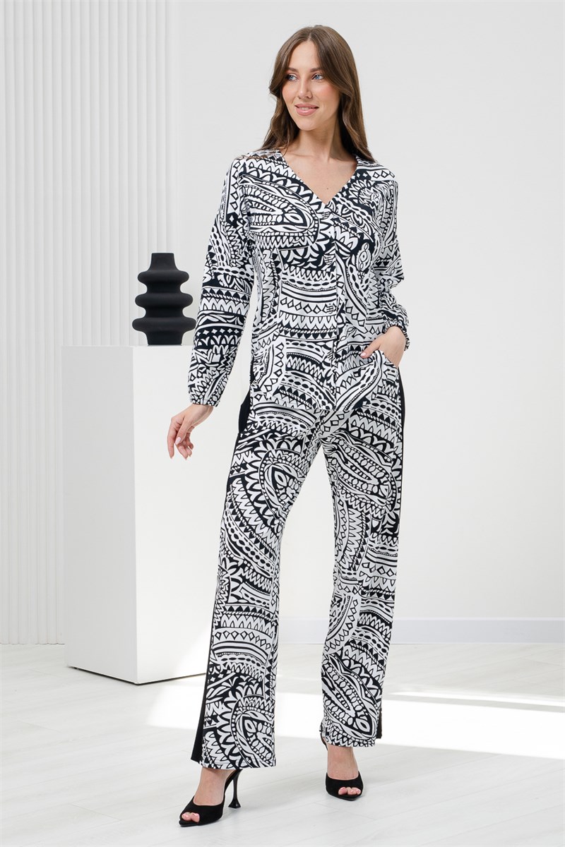 Женская туника-рубашка на пуговицах, без воротника, с V-образной горловиной спереди, с фигурной линией низа. Рукав длинный, низ собран на резинку.