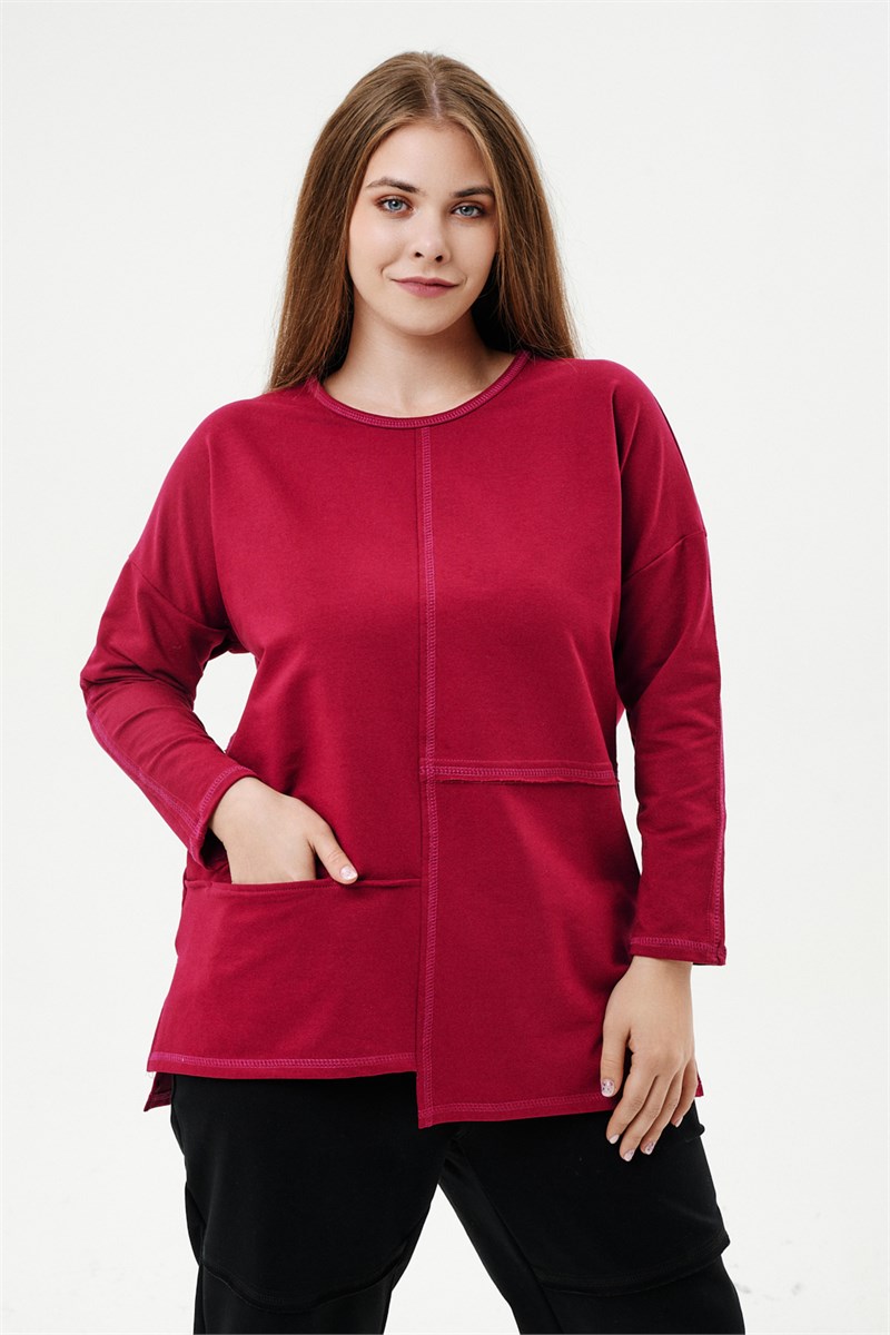 Туника прямого силуэта, горловина круглая, рукав длинный, цельнокроенный со швом, состоит из передней и задней частей. Полочка из четырех частей: на правой части внутренний горизонтальный карман в шве, на левой горизонтальный шов с открытыми срезами, аналогичный шов на спинке. В боковых швах разрезы.