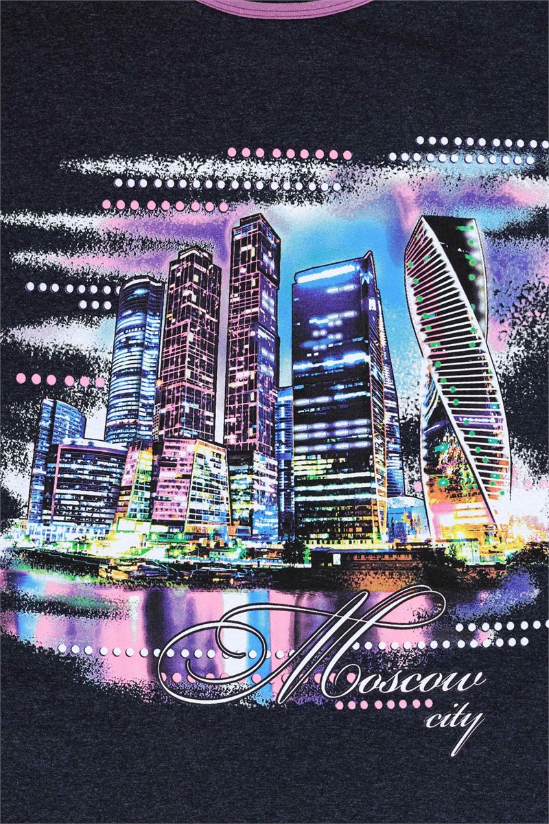 Стильная туника из кулирки. Принт изображает панораму небоскребов Москва-Сити, фиолетовая окантовка. Рукав короткий, длина чуть выше коленей. Оттенок ткани может отличаться