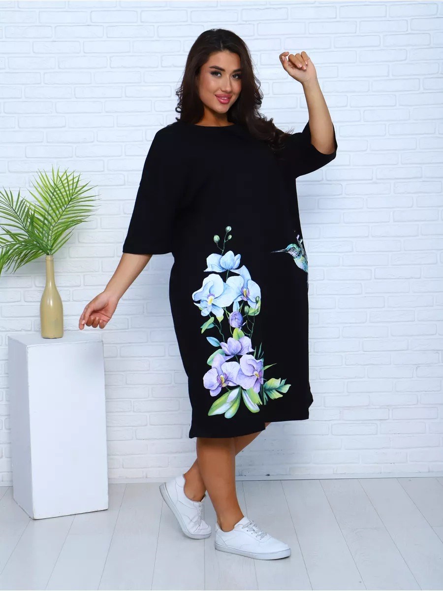Платье - футболка для дома больших размеров из 100% хлопка. Приятная к телу дышащая ткань из которой сшиты наши туники в форме удлиненной футболки свободного кроя - идеальная версия домашней одежды. Большой рисунок с цветами и яркой колибри не смоется и не выгорит на солнце, не потускнеет от многократных стирок. Платье черного цвета выглядит наиболее выигрышно, а рисунок на нем смотрится особенно ярко и насыщенно. На средний рост длина платья будет ниже колена, на высоких девушках оно сядет чуть короче.