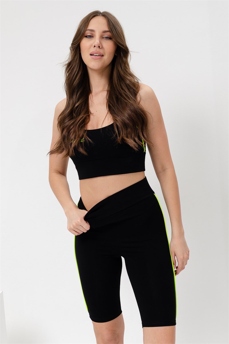 Велосипедки женские, спортивные, с ярким кантом в боковых швах, на широком эластичном поясе.