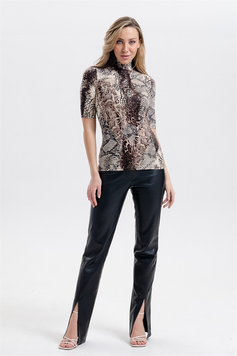Водолазка с коротким рукавом станет базовым элементом вашего гардероба. Будет отлично сочетаться с юбкой, джинсами или брюками, можно надеть с пиджаком или курткой - выбирать вам. Модель выполнена из мягкой вискозы, ткань лёгкая в уходе, хорошо тянется, что придаёт комфорт в движении и удобство в использовании. Благодаря приталенному крою и эластичным свойствам ткани, наша водолазка облегает фигуру. Воротник-стойка имеет комфортную высоту и плотно прилегает к шее. Облегающий рукав до сгиба руки в локте добавляет стиль и комфорт. Принт, имитирующий змеиную кожу, не оставит вас равнодушной, универсальность этой расцветки позволяет сочетать её с разнообразной цветовой палитрой и элементами одежды.
