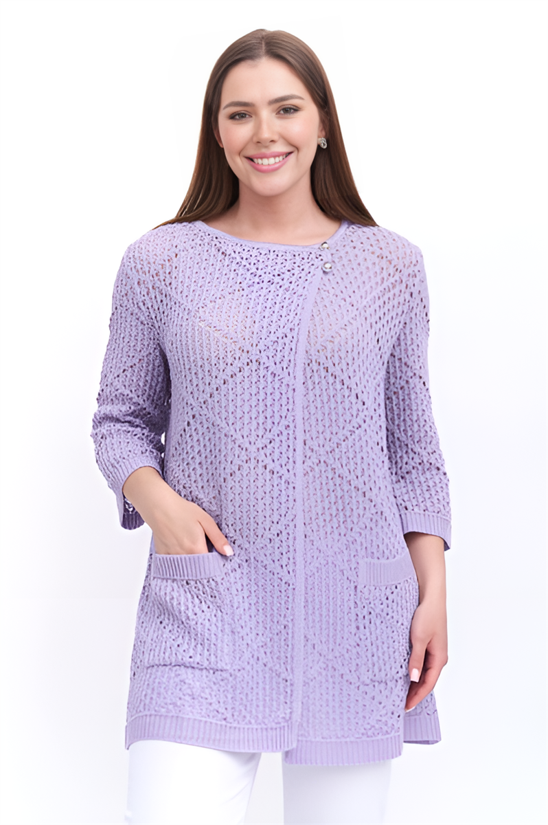 Ажурный вязаный жакет свободного силуэта с запахом. Застёгивается на декоративную брошку. Рукава втачные длиной 7/8. Модель имеет накладные карманы, что определяет практичность и удобство данной вещи. Изделие можно сочетать с брюками и юбками разных фасонов. Декоративные элементы Внимание! Декоративные элементы и фурнитура могут отличаться от заявленного на фото!