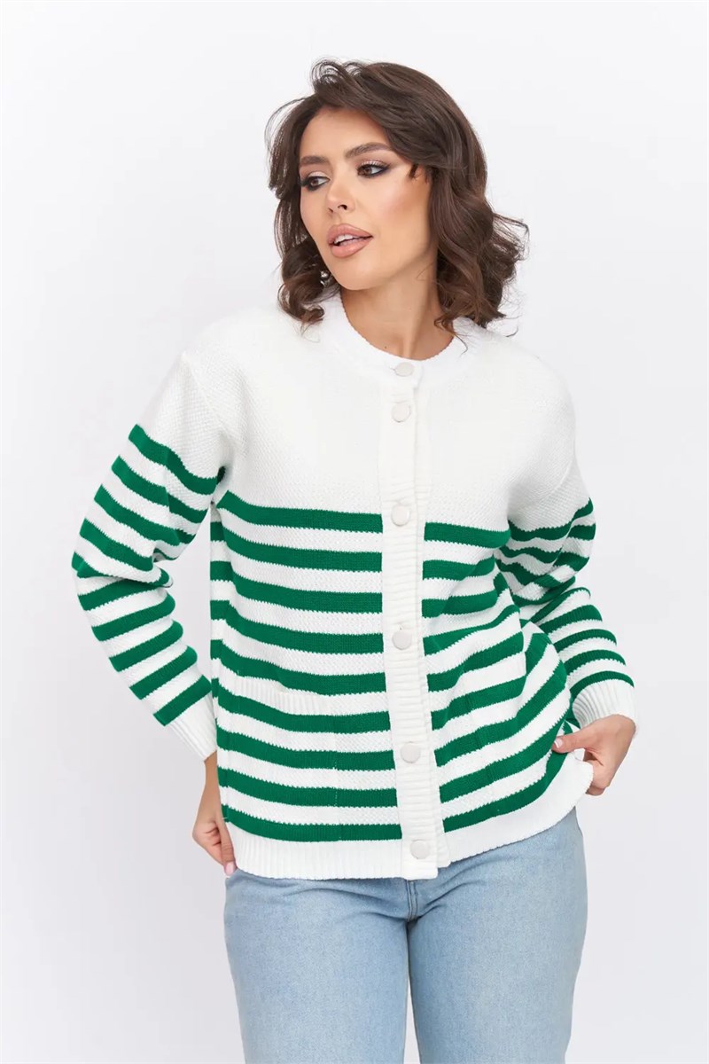 Жакет женский вязаный полуприлегающего силуэта на пуговицах в полоску с круглой горловиной. Спущенная линия плеча, рукав длинный. Манжет рукава, низ изделия и планка выполнены эластичная резинкой. Жакет выполнен из качественной пряжи с составом 30% шерсть 70% ПАН. Легкий, яркий, эффектный жакет поддержит и деловой образ, и праздничное настроение. Отлично сочетается с любым низом в комплекте. Модель классическая, праздничная и повседневная, абсолютно на любой случай жизни.