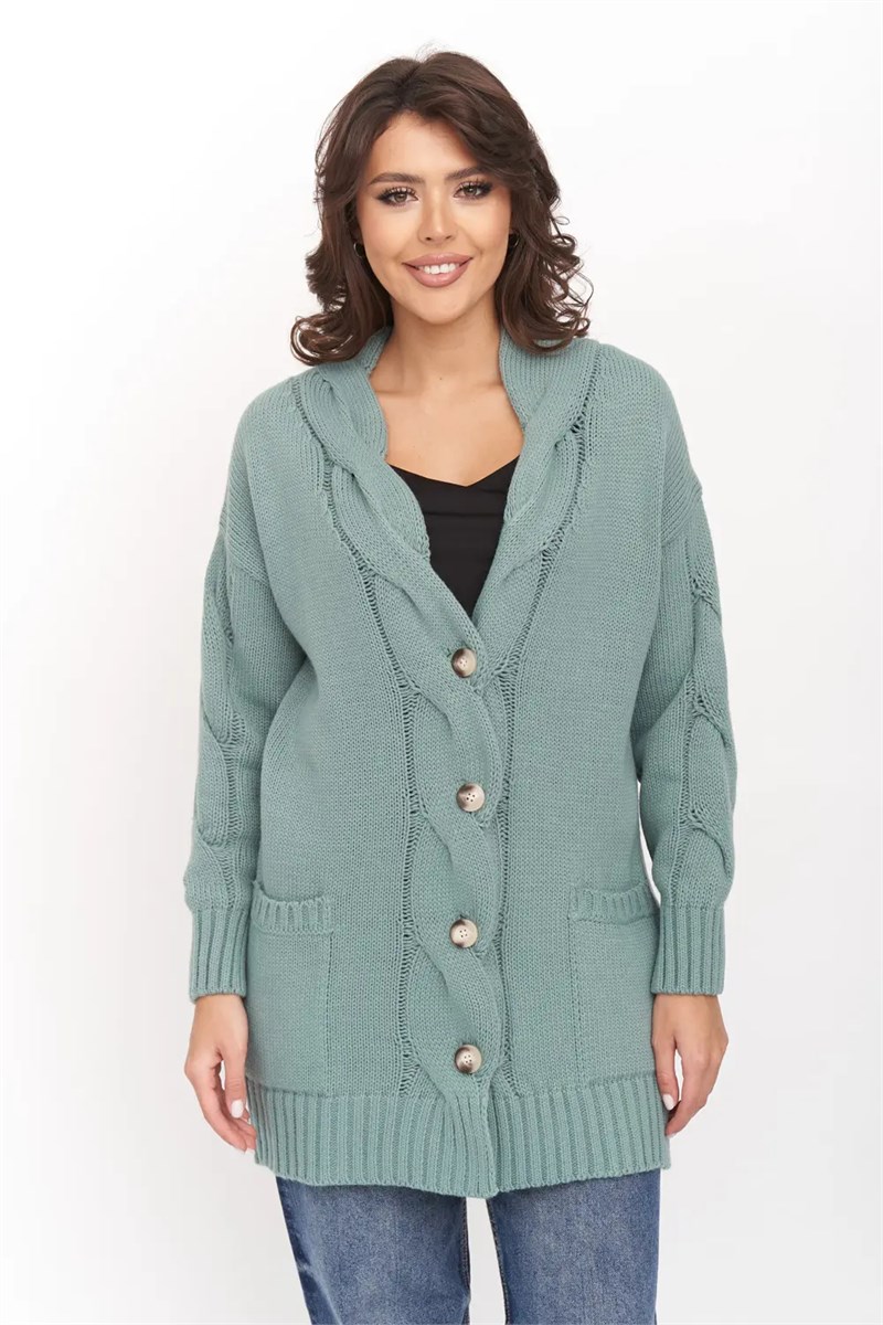 Вязаный женский жакет имеет умеренно-свободный силуэт и комфортную посадку по фигуре, оверсайз. Спущенная линия плеча, рукава длинные. Жакет застегивается на пуговицы. Вязка косами на отделке горловины и рукавах делают жакет с v-образным вырезом незаменимым элементом гардероба каждой современной женщины. Низ изделия и манжеты выполнены эластичным переплетением. Женский жакет с добавлением шерсти в составе согреет в прохладную погоду, добавив шарма в строгий деловой образ, станет Вашей любимой вещью в любое время года.