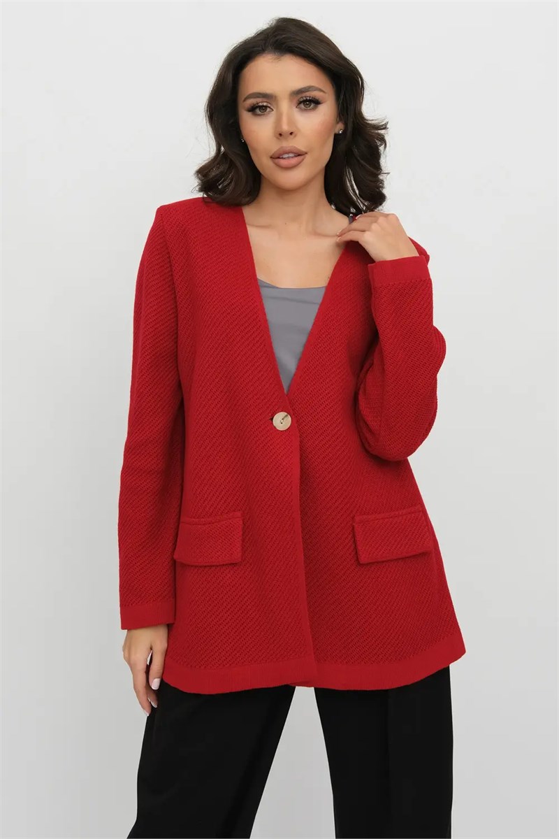 Женский вязаный жакет полуприлегающего силуэта на пуговице с V-образным вырезом. Рукава втачные, длинные. Жакет выполнен из качественной пряжи с составом 30% хлопок 70% ПАН. Модель имеет клапан, имитирующий карманы. Жакет выполнен переплетением, образующим диагональный рубчик. Легкий, эффектный жакет поддержит и деловой образ, и праздничное настроение. Отлично сочетается с любым низом в комплекте. Модель классическая, праздничная и повседневная, абсолютно на любой случай жизни.