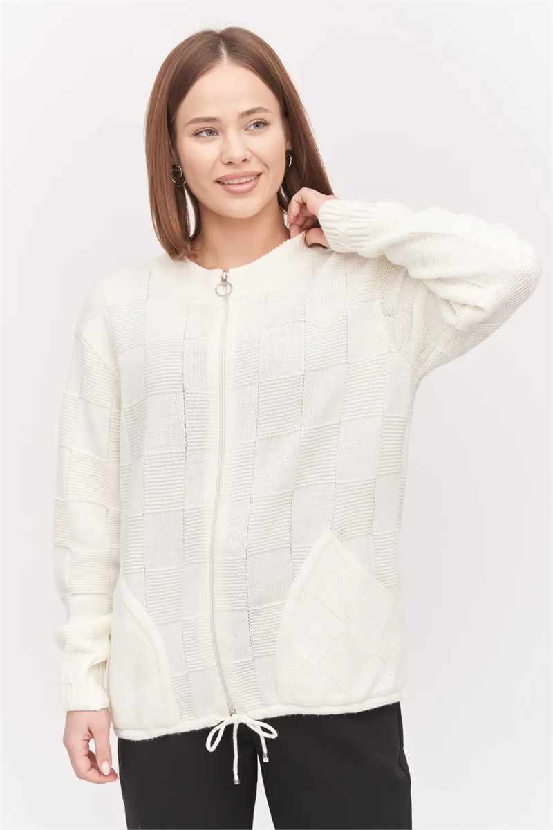 Жакет женский на молнии свободного силуэта со спущеной линией плеча. Круглая горловина. По бокам вязанного жакета два накладных кармана. По низу изделия проложен шнурок. Структурная вязка образует клетку. подойдет для любого типа фигуры и составит оригинальный, модный и женственный образ абсолютно с любым низом: юбка, брюки, джинсы.