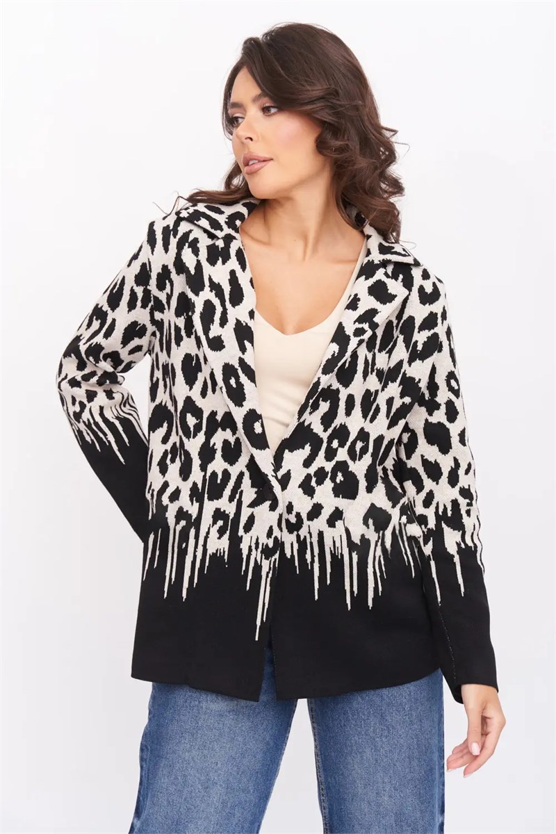 Женский жакет из вязаного трикотажа прямого силуэта с V-образным вырезом, английским воротником. Рукав втачной длинный. Застёжка спереди на пуговицу. Изделие выполнено жаккардовым переплетением, образующим анималистический принт.